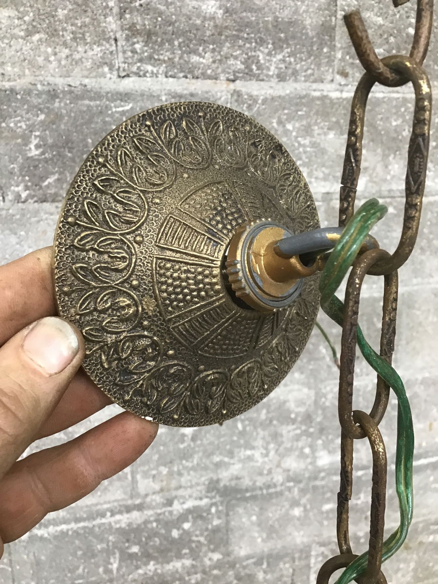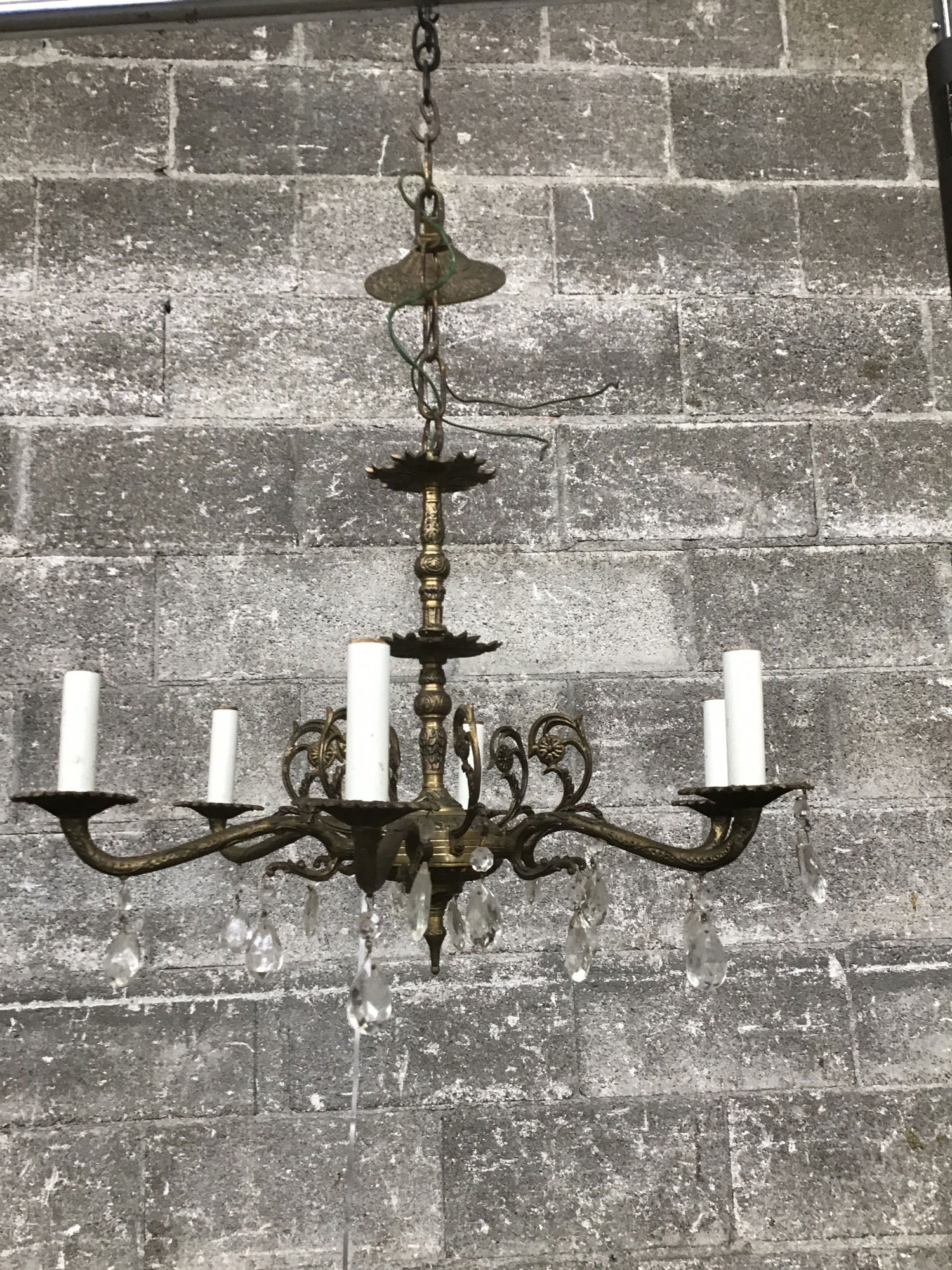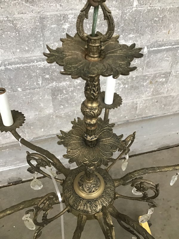 Ornately cast brass 6 arm chandelier with original fitter. It could use a dusting and looks to be missing a few crystals but is in usable condition as-is. This fixture was re-wired at some point in recent history; however, they used a green wire and it stands out in a less than ideal way. Overall a great lamp that needs a little love to make it sparkle again; price reflects.