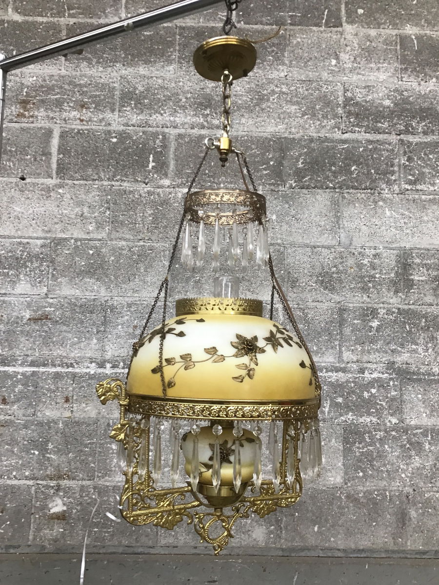 Ornate Victorian style parlor light in bright brass. This conversation piece features a glass shade inlaid with cast brass flowers, hanging crystals, and a lantern style socket holder. Very fun lamp from the 80's that needs a cleaning but is in overall great shape.