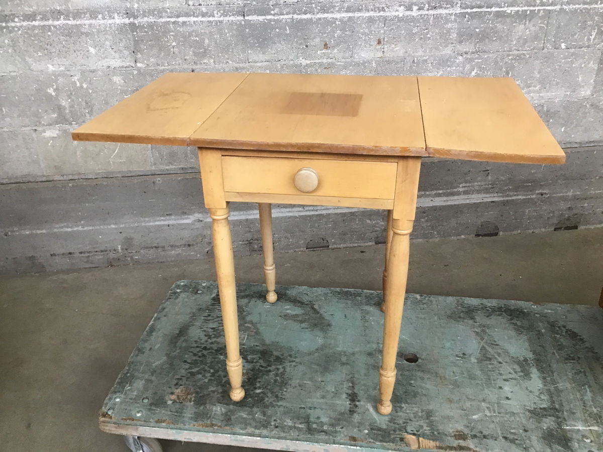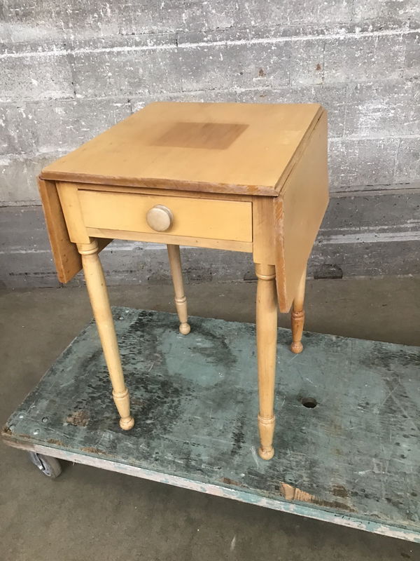 This is a small drop leaf table that isn't quite dining table size but perfect for a little auxiliary table for prepping food or maybe holding fruit bowls. Total length when leaves are up is 35.5".
