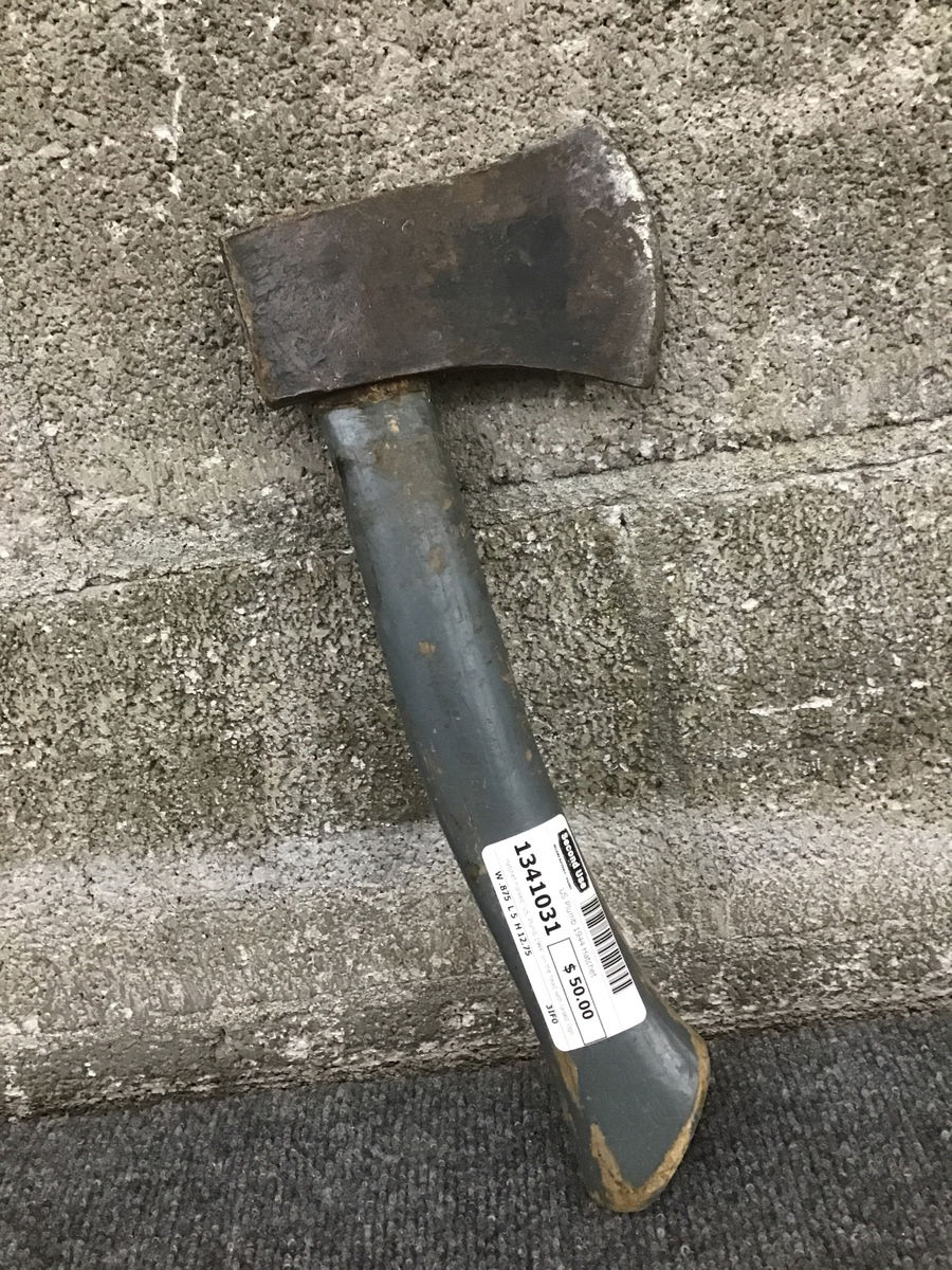 Hatchet marked "US, Plumb 1944" on the head with raised logo. Handle has been painted gray