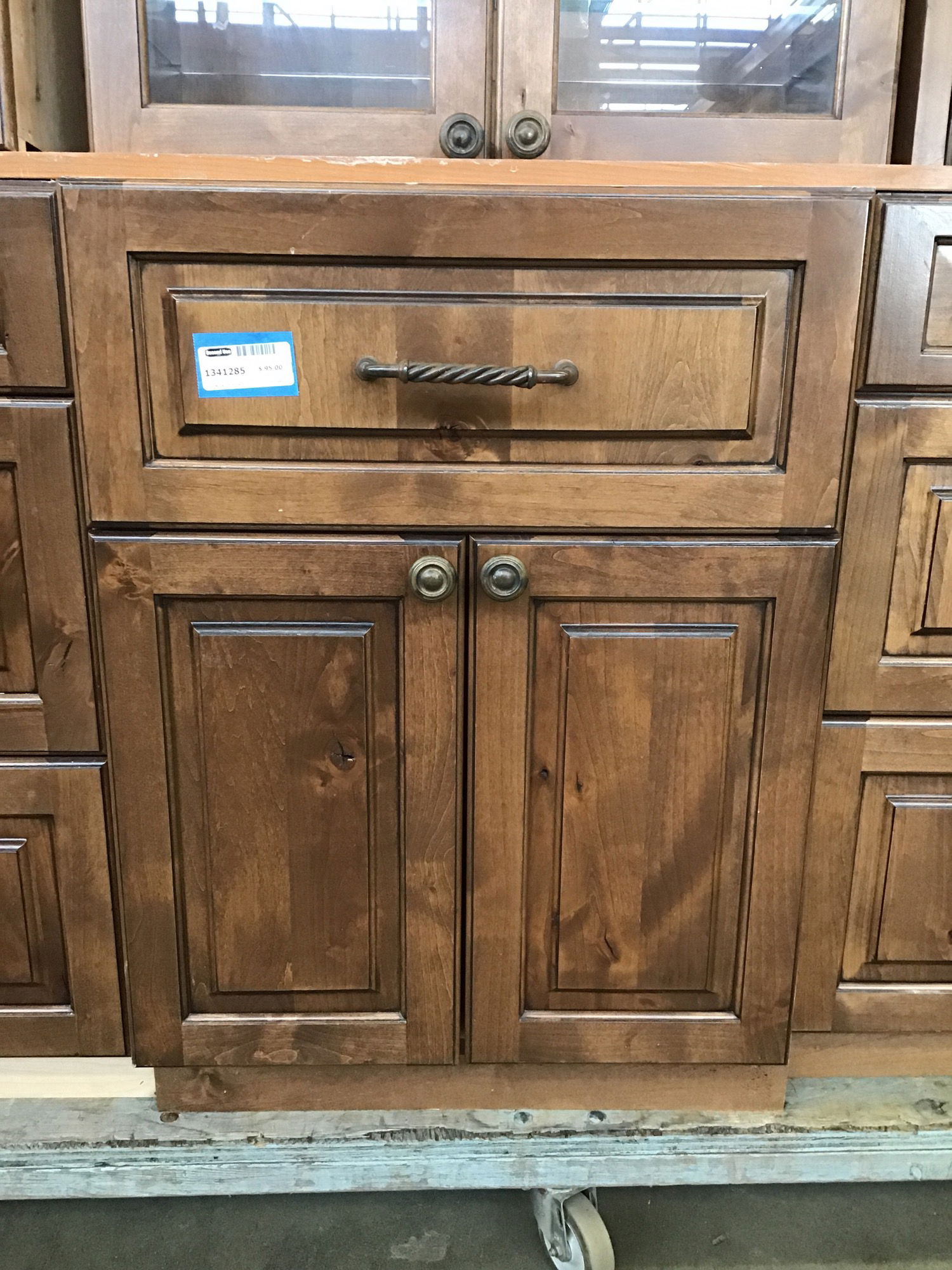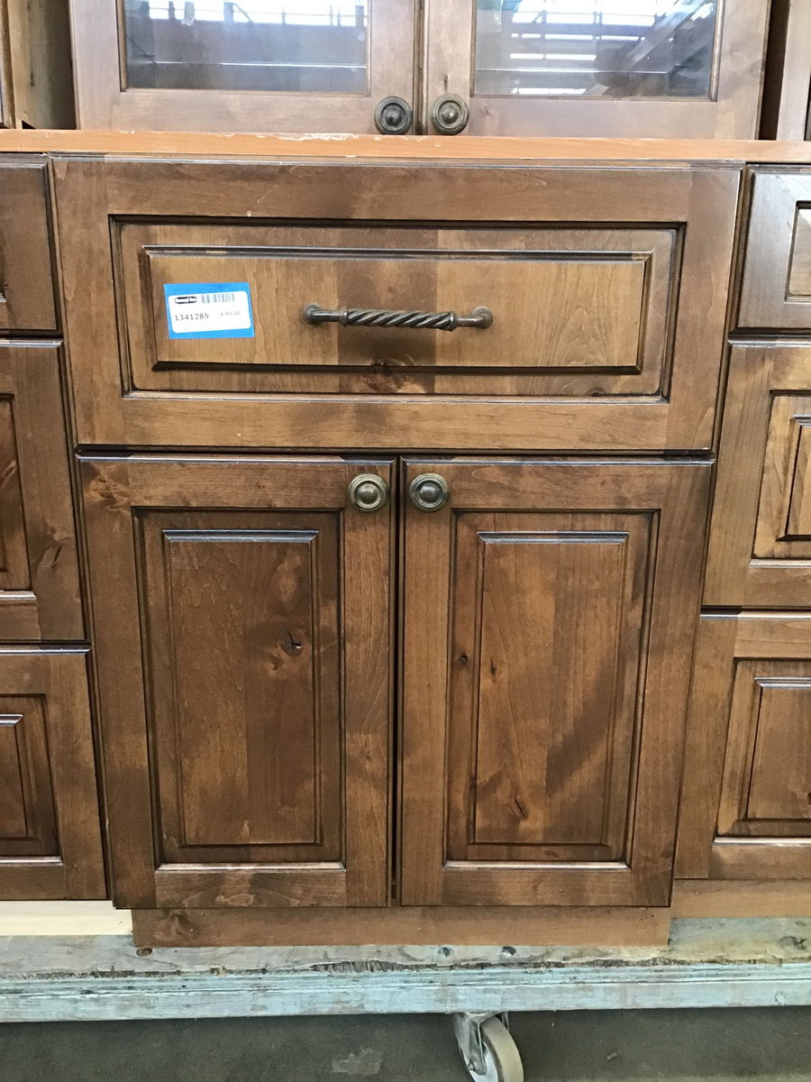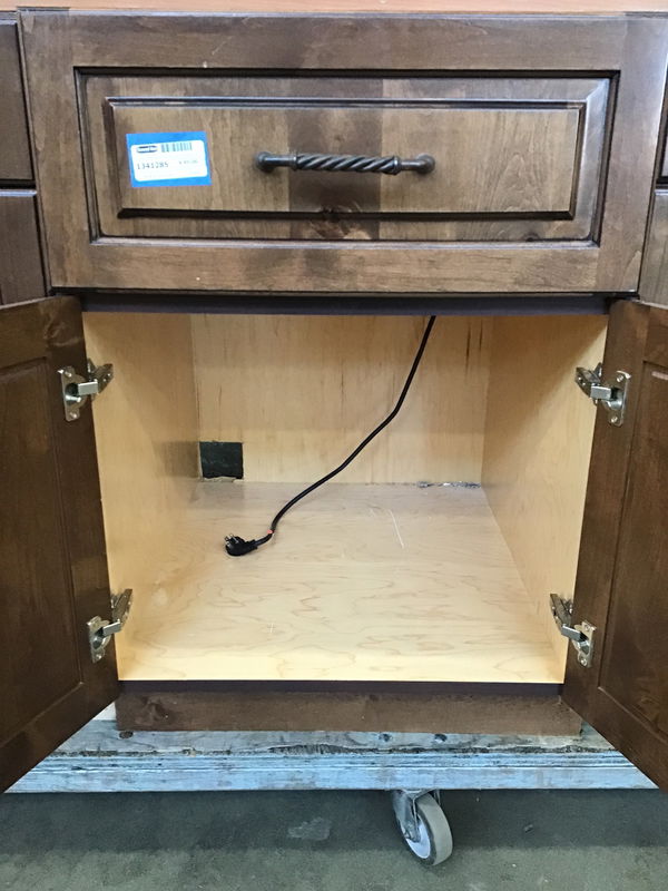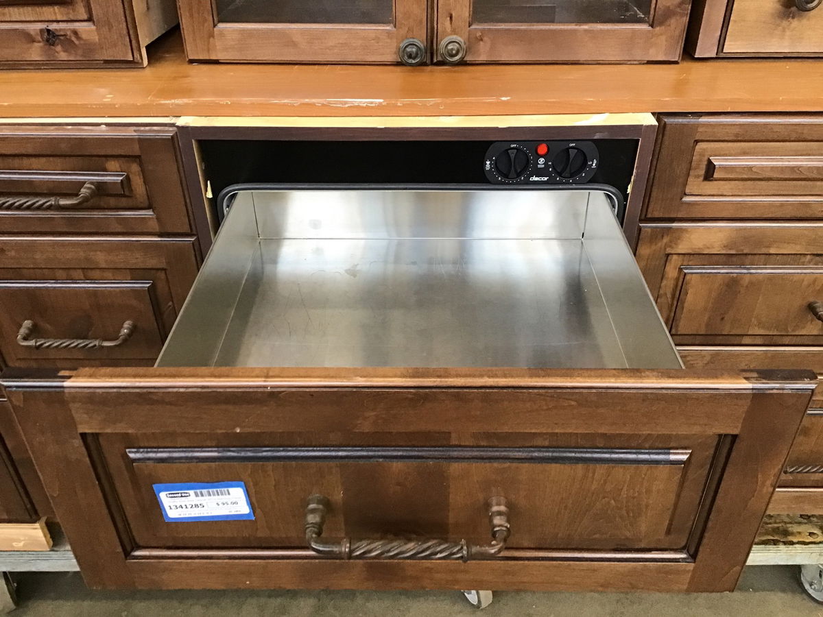 Dark stained knotty alder base cabinet that's deeper than most and has a 22 3/4" wide x 9 1/8" tall opening for the included Dacor warming drawer, which plugs into a 120 volt outlet. You could take the face off the warming drawer and build a drawer box or just attach to face for a prep sink cabinet.