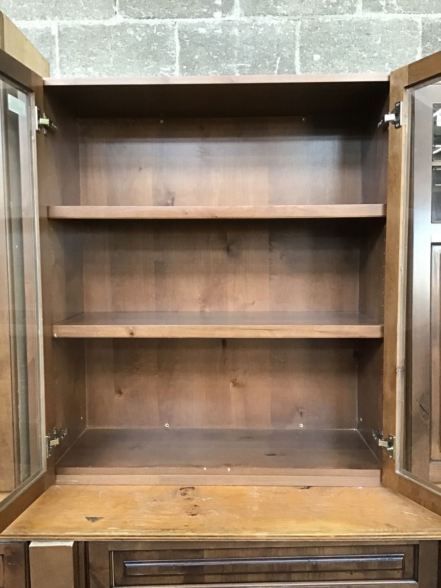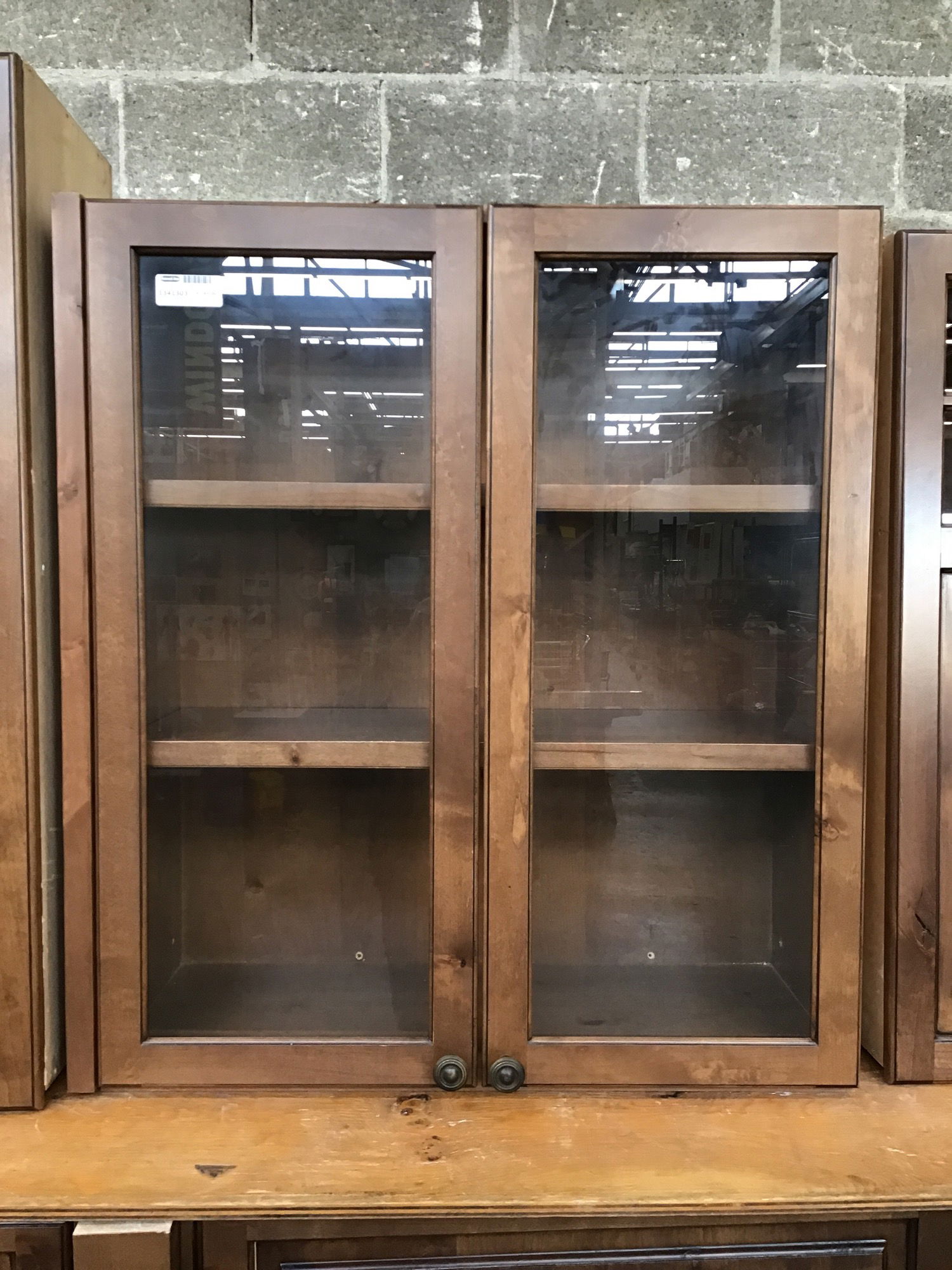 Dark stained knotty alder wall cabinet with glass doors. Left side is finished.