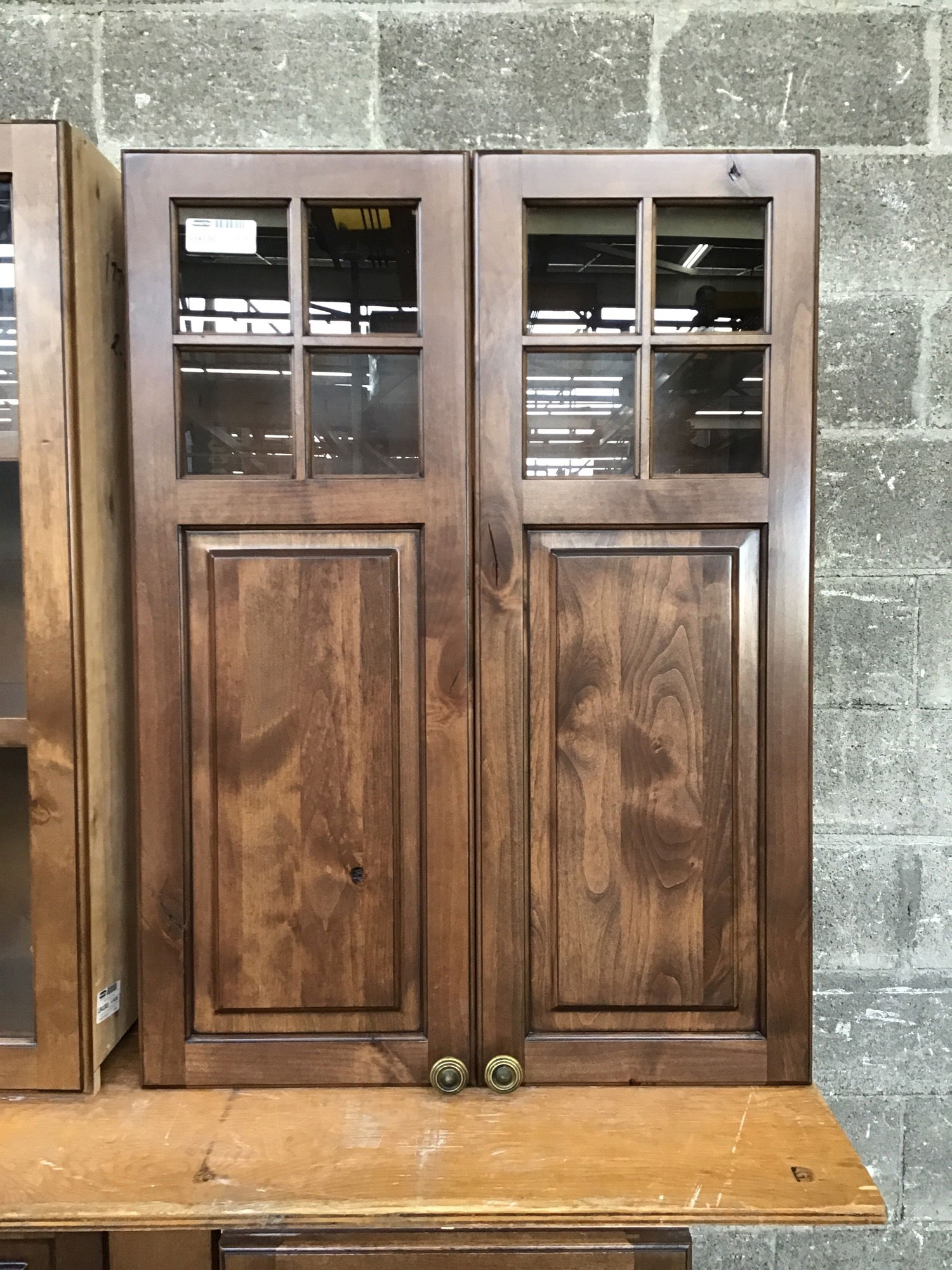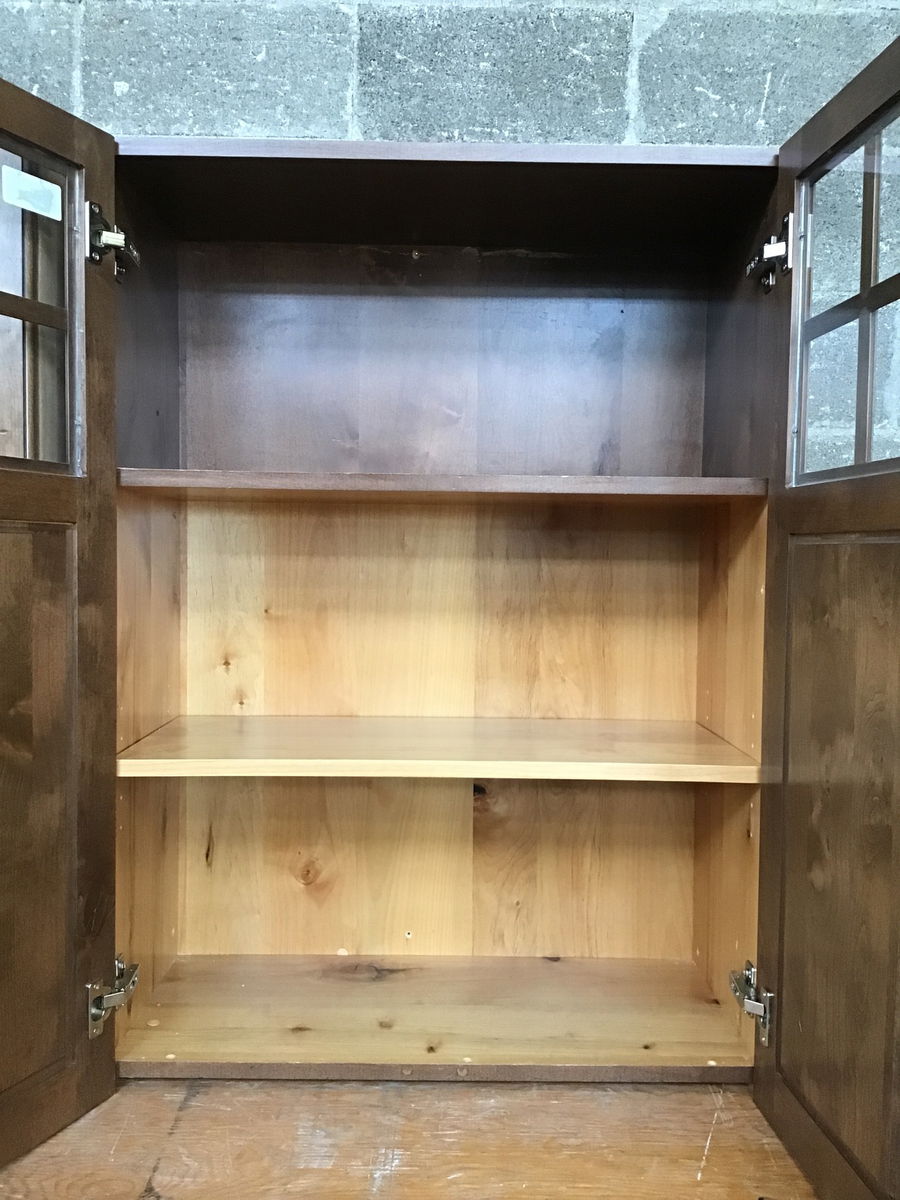 Dark stained knotty alder wall cabinet with glass doors. Left side is finished.