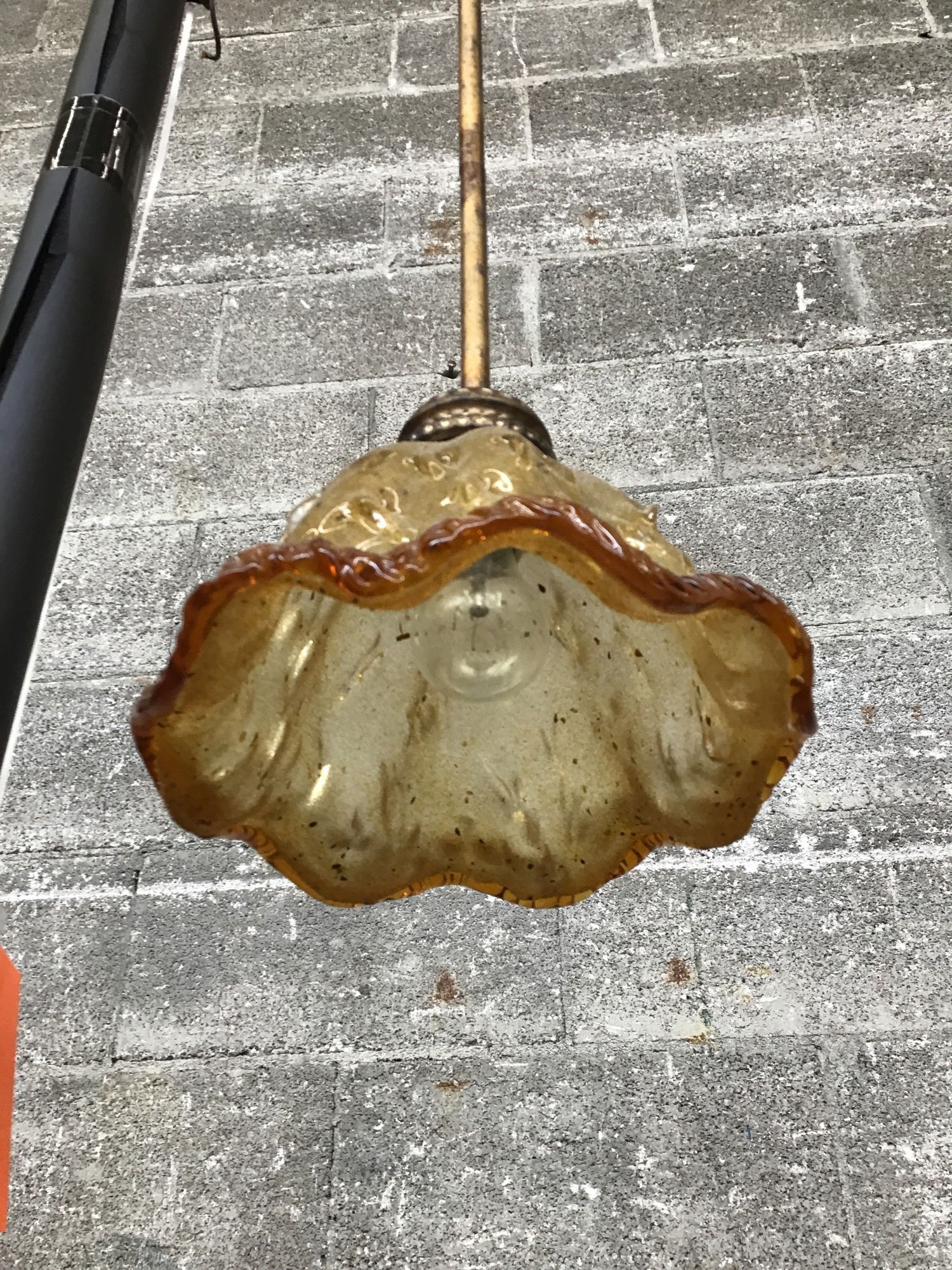 Tuscan Revival-style pendant light with a handblown shade with some lovely texture and dimension added to its surface. Arm and fitter have an antiqued finish with faux hammered accents.
