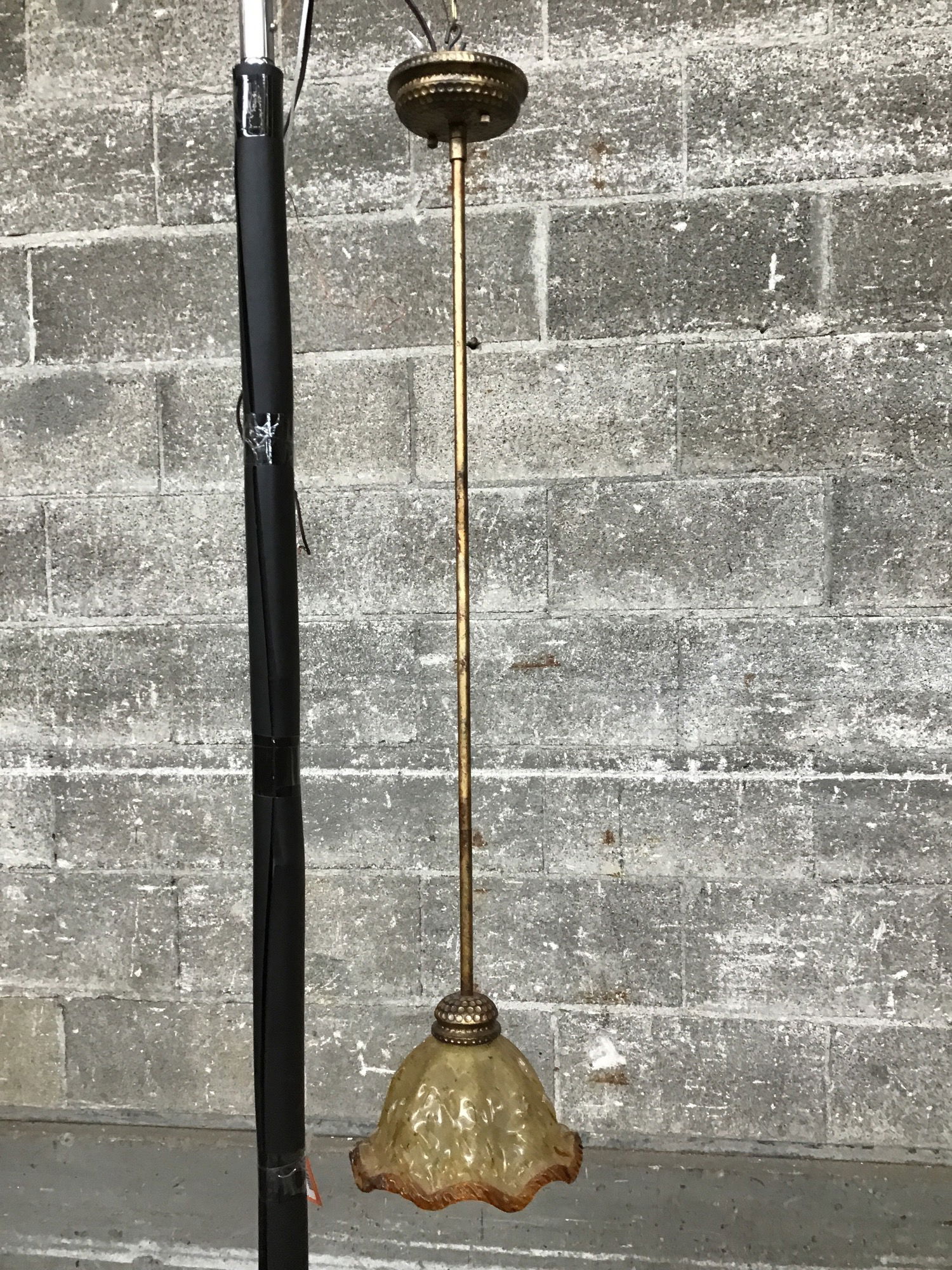 Tuscan Revival-style pendant light with a handblown shade with some lovely texture and dimension added to its surface. Arm and fitter have an antiqued finish with faux hammered accents.