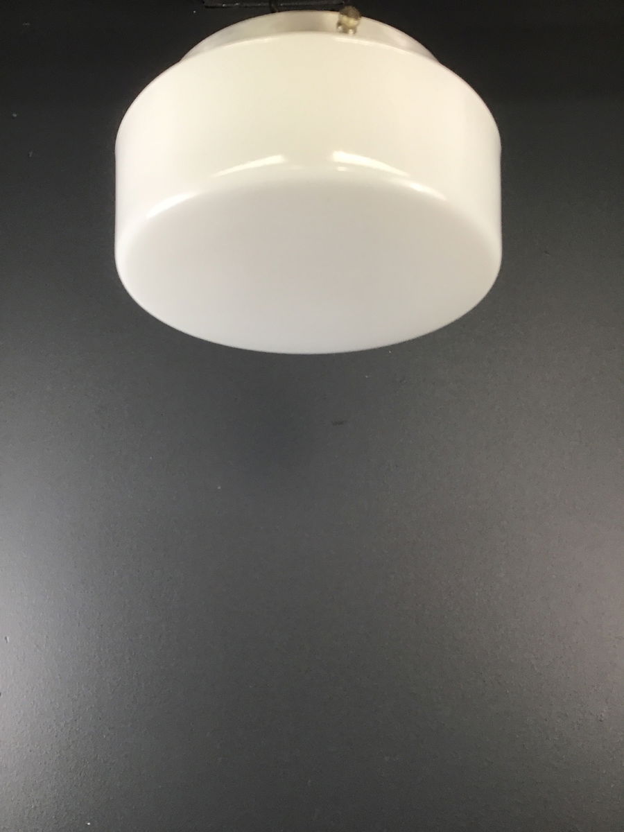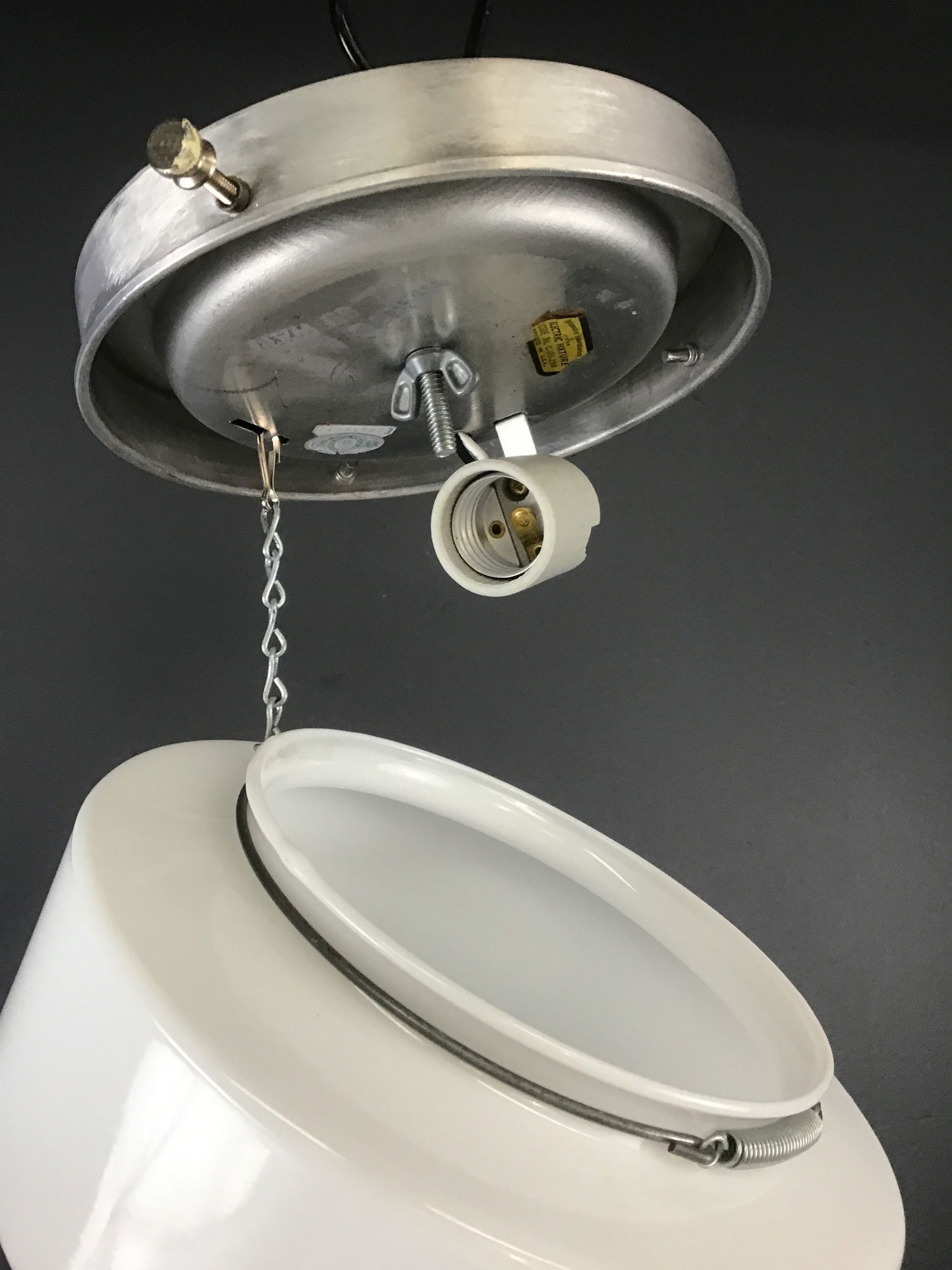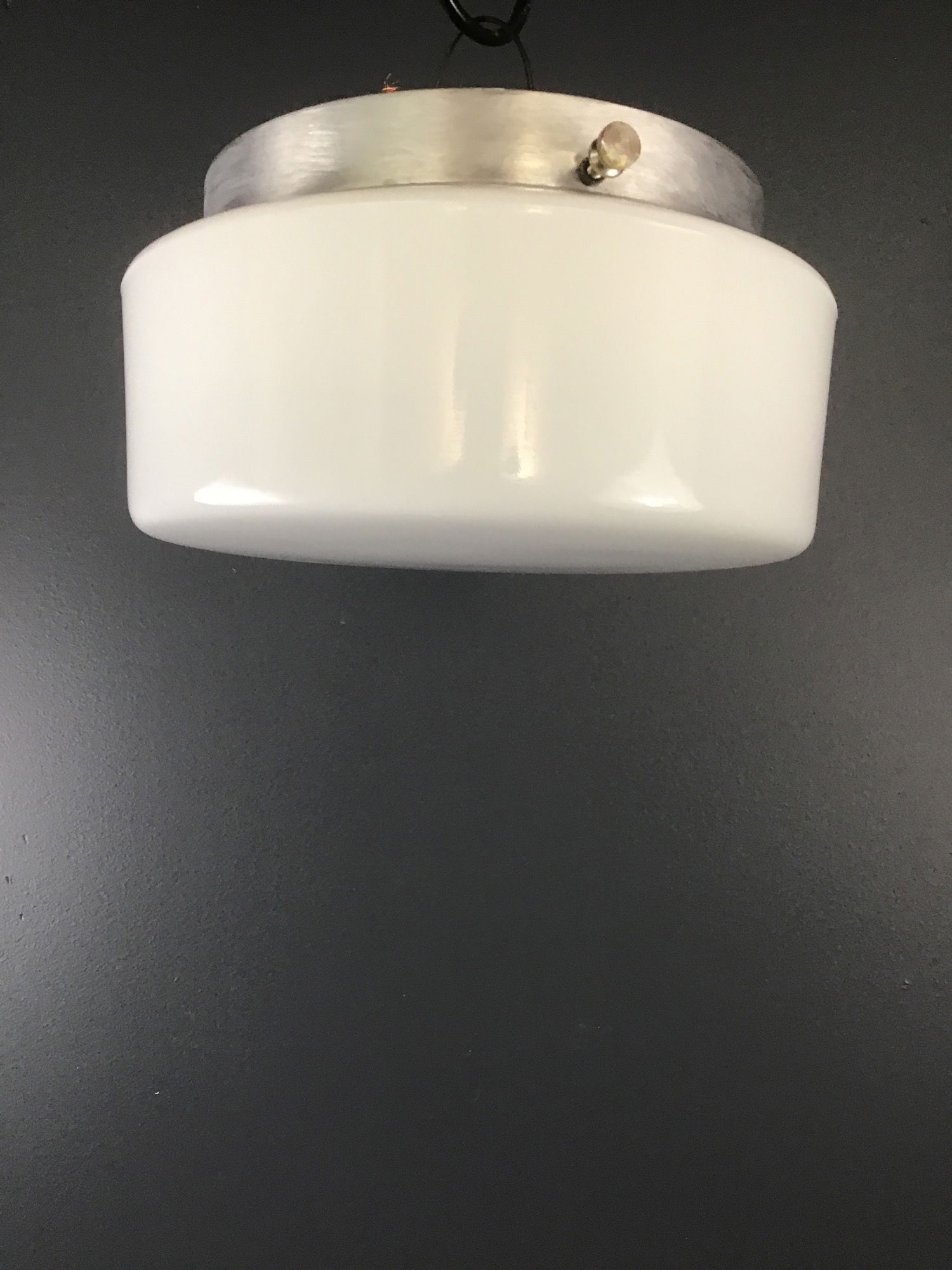 A vintage 1950s MCM flush mount ceiling light made by Marco L.A.. It has a white glass globe that hangs on an aluminum base. It comes with a chain that is hidden when put together, but keeps the globe from falling if you slip while changing the light bulb! So neat! Restored in our on site light repair workshop