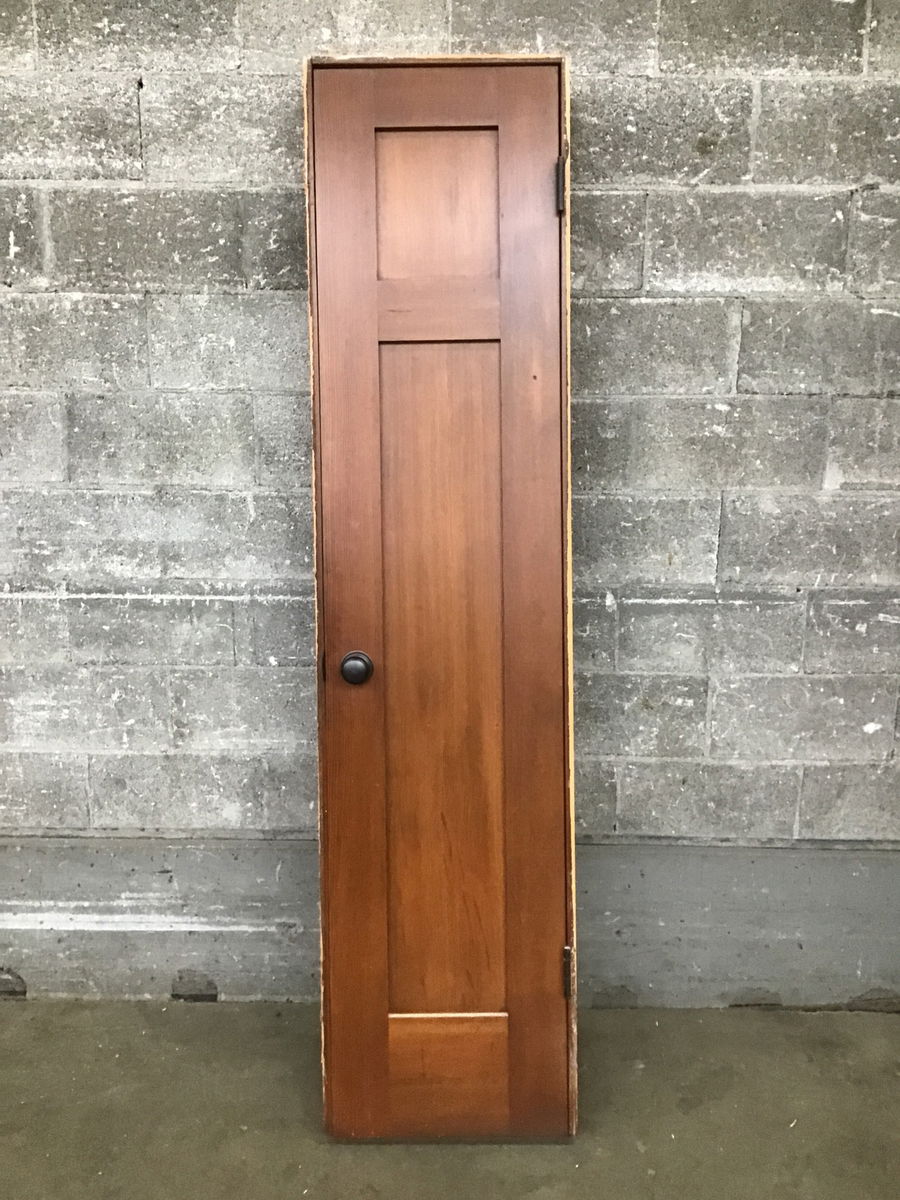 Nicely stained (medium/dark reddish brown) CVG fir Shaker style two panel in jamb for 2x4 wall. Has nice looking antique brass finish hardware. This is the skinny version of a Craftsman style four panel.