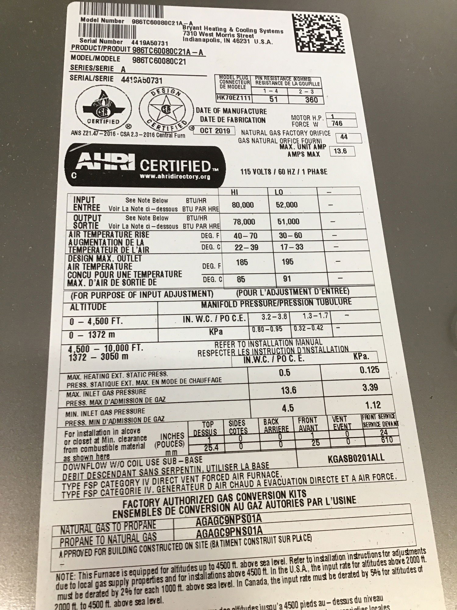 ’19 Bryant Forced Air Gas Furnace