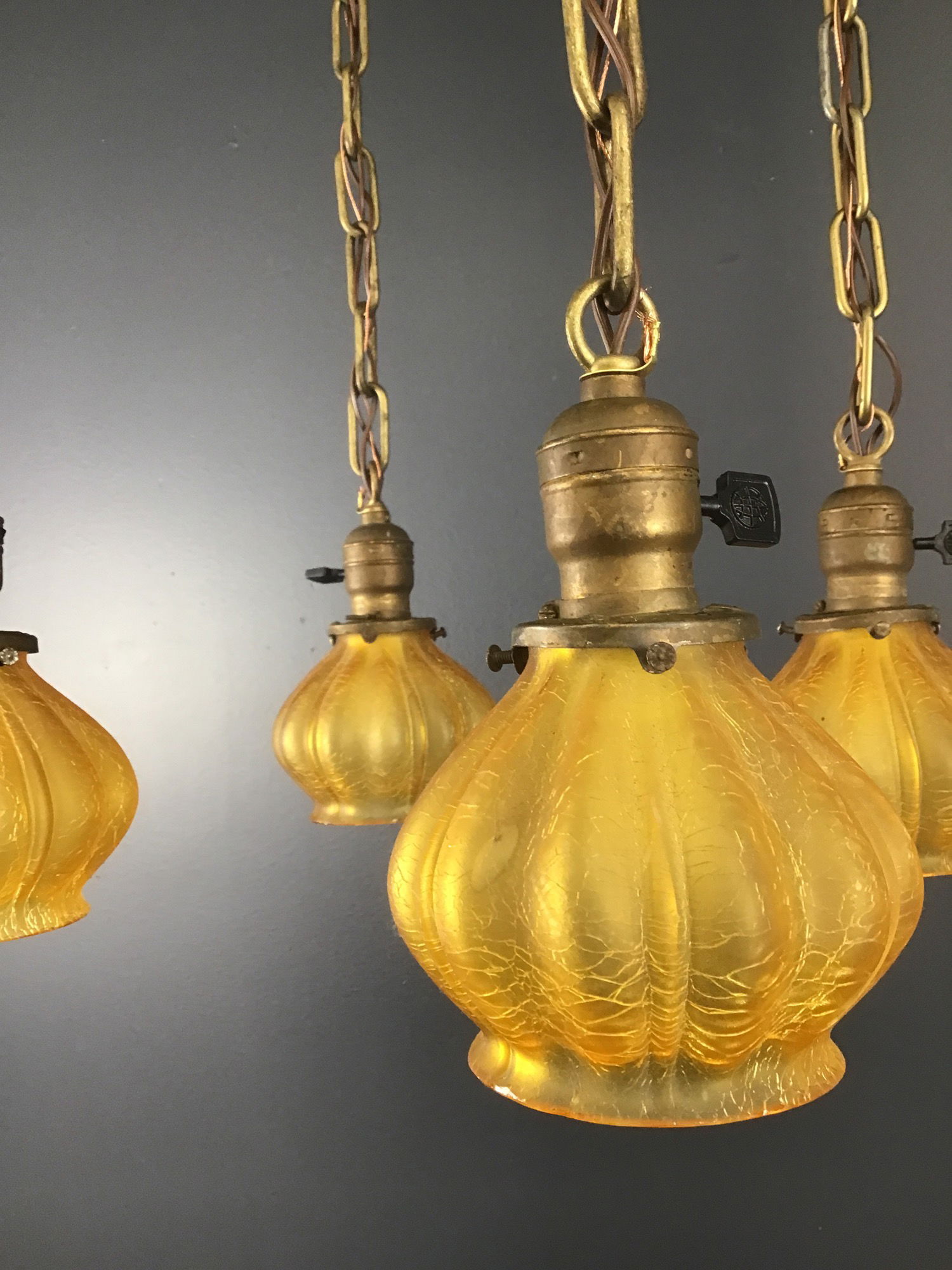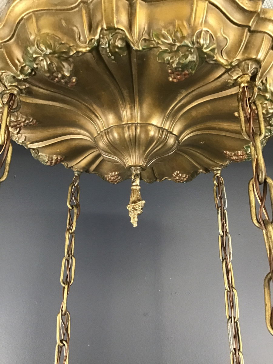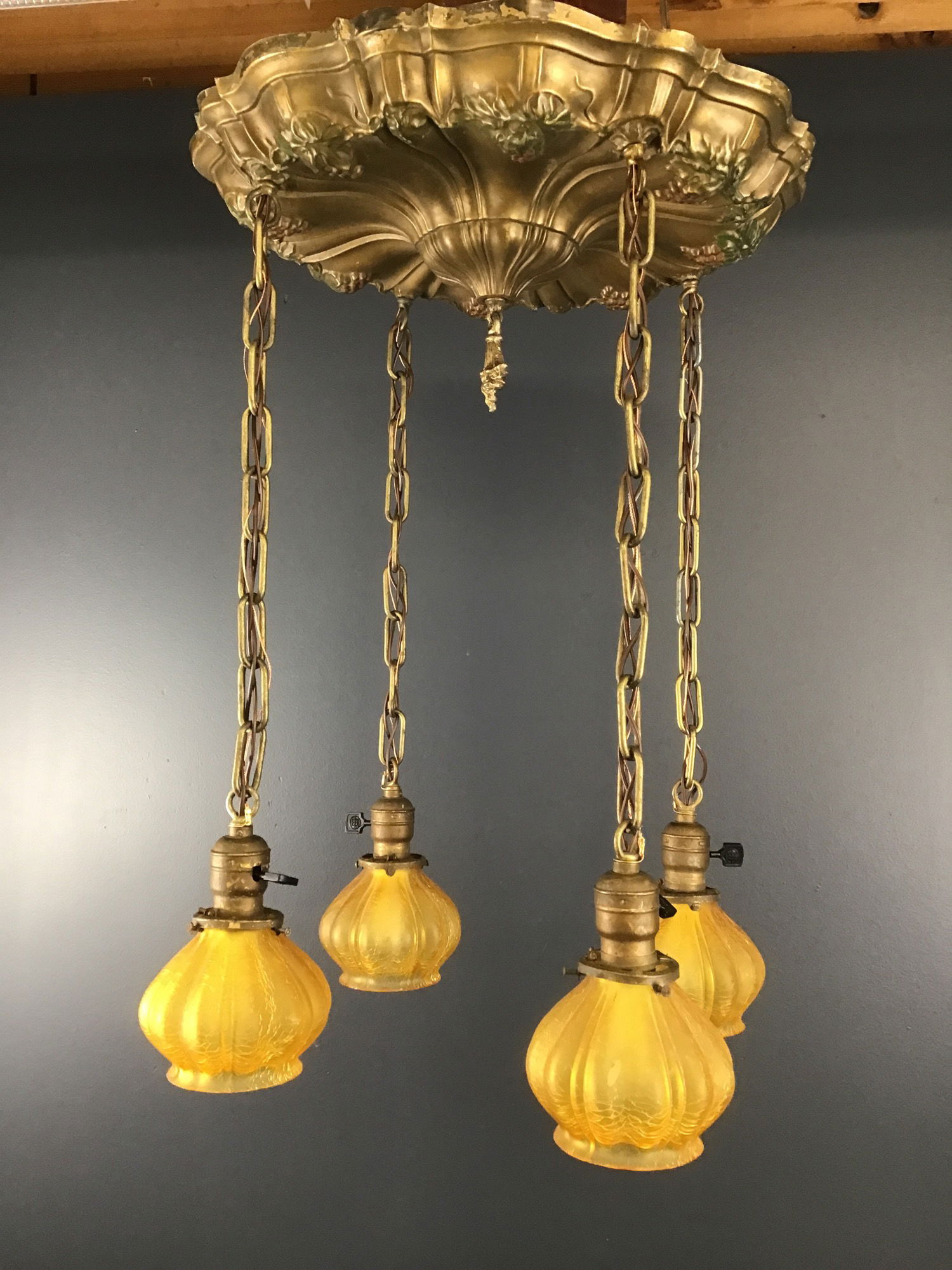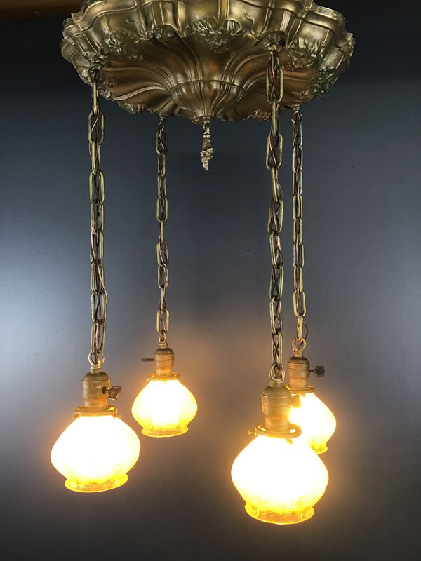 A gorgeous circa 1910s shower ceiling light. Four beautiful amber crackle glass shades hangs down on chains from a pan stamped in the Sheffield style with grapes and leaves that still have their original paint! Some of the original paint has worn off, but this is still a glorious example of early electric lighting! Restored in our on site light repair workshop