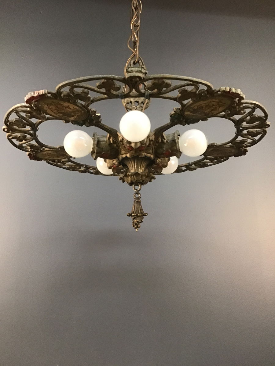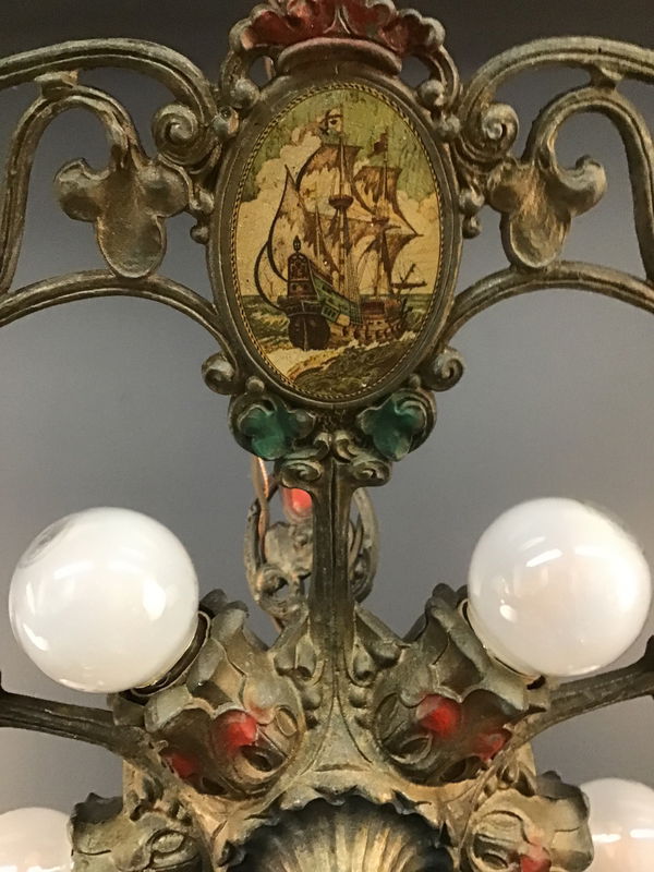 A rare and stunning 1920s Spanish Revival 5 socket chandelier made by the Riddle Co of Ohio. It features 5 sockets that radiate out from the center with very ornate socket covers, and has 5 cameos depicting Spanish galleons. So cool! As well as in a Spanish Revival house, it would look lovely in a Tudor Revival, or Craftsman house. Restored in our on site light repair workshop. Light bulbs not included