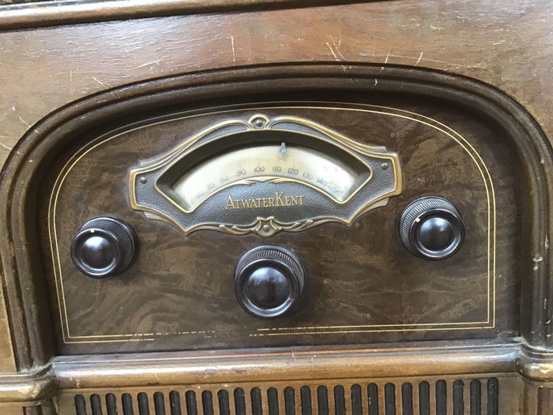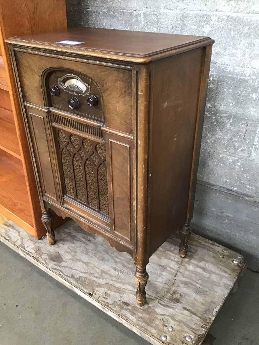This is an antique 1931 Atwater-Kent tube radio cabinet. Made with walnut throughout, there is some stunning walnut burl veneer on the face. When plugged in it still works! The tuning knob has issues but I was able to tune in to some finance show on AM radio. The legs have seen some wear and could use some love, other wise this is great piece that if refinished could be a great project to invest in.