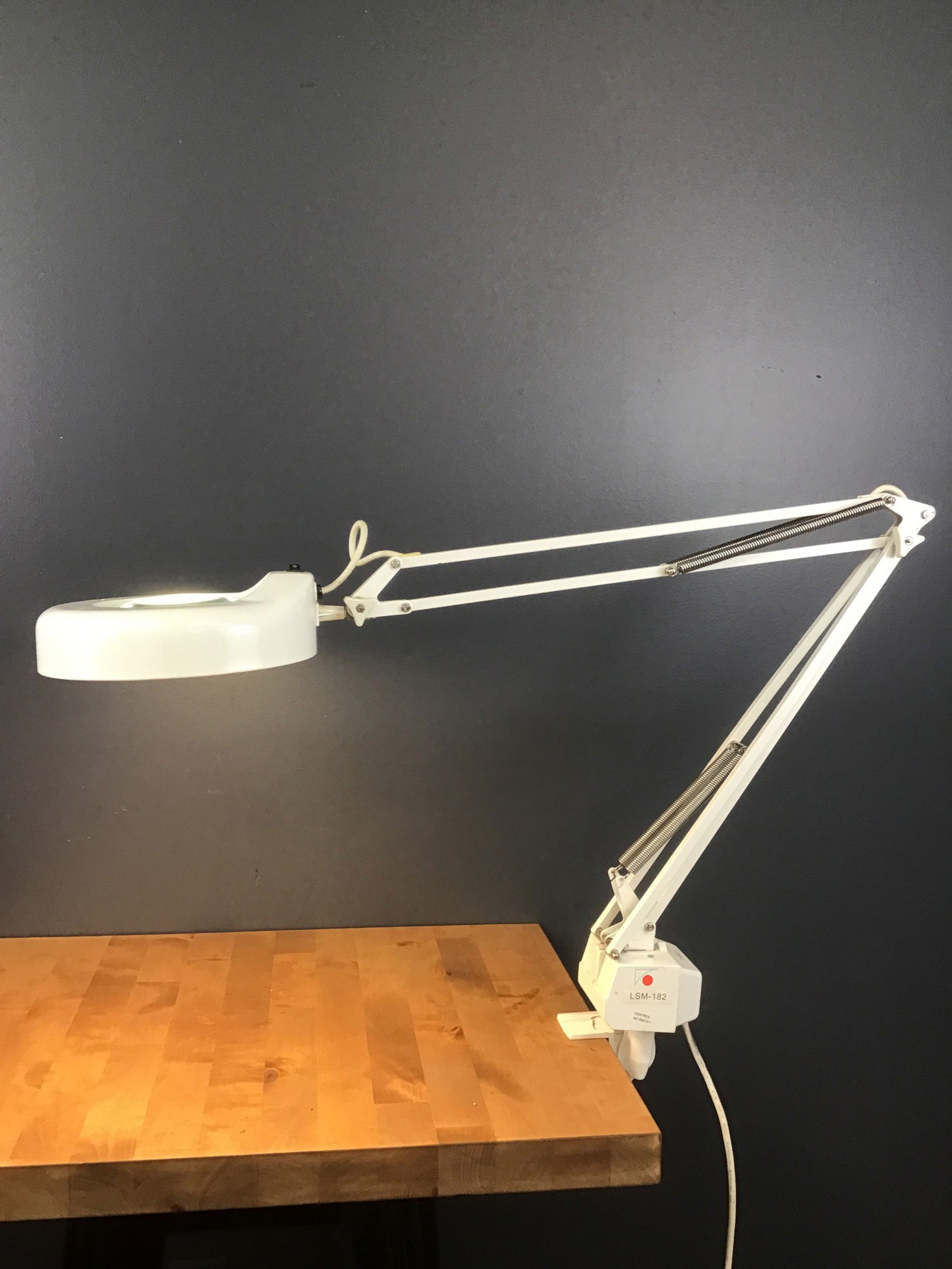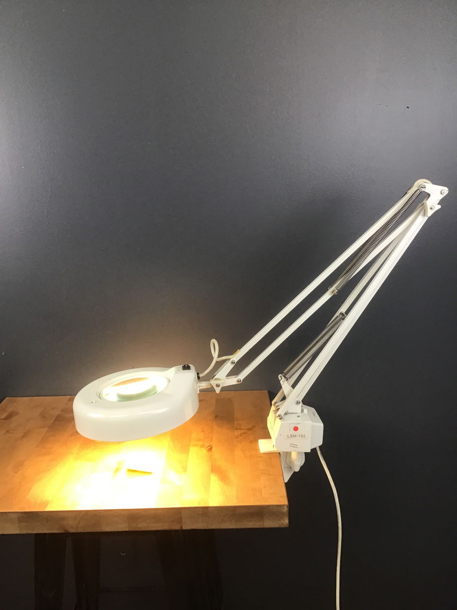 A vintage 1980s LTS magnifying articulating swing arm task lamp/jewelers lamp in white. Still has it's bracket!