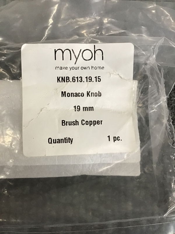 Bag of twenty Make Your Own Home (MYOH) "Monaco" cabinet knobs with a "Brush Copper" finish. One was out of package and might need a machine screw, and I took one out to confirm they were all the same. These pulls look to sell for over $30 each when found online.