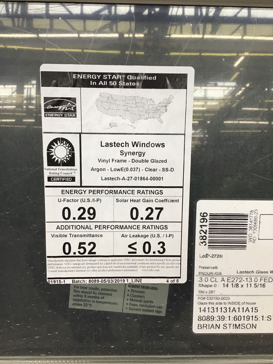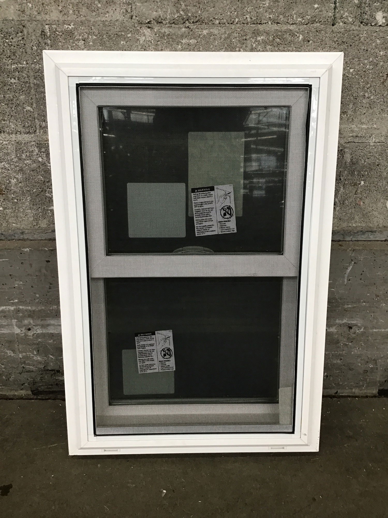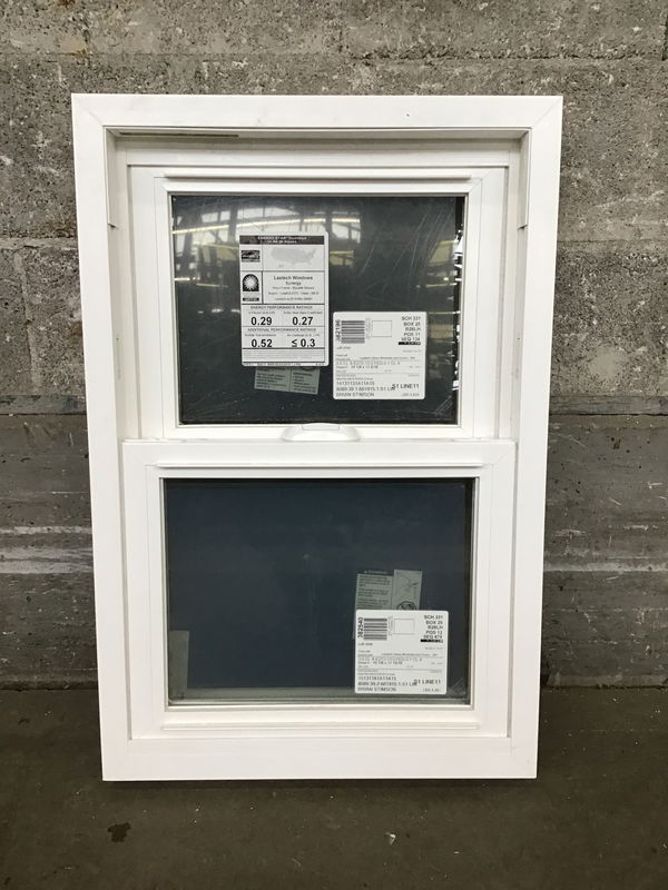 New, never installed 2019 double hung vinyl window with energy tags attached.