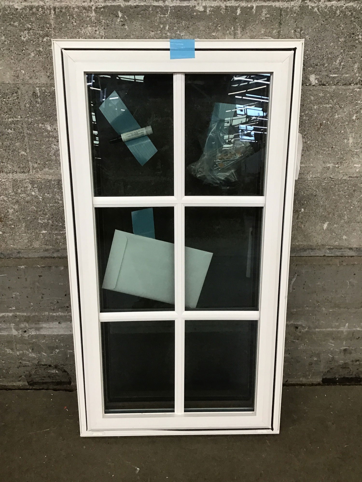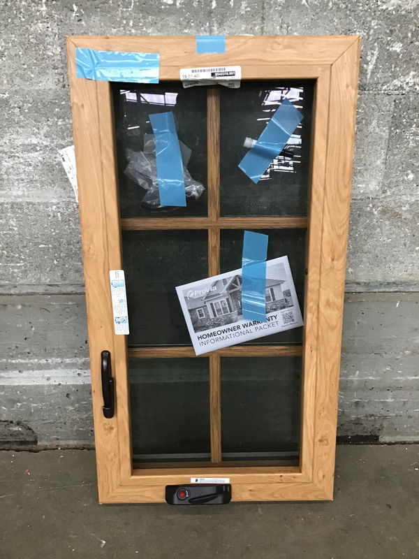 New, never installed, mostly vinyl casement window with some sort of wood grain laminate on the inside that is peeling in spots. Lived previously as a sample at window shop.