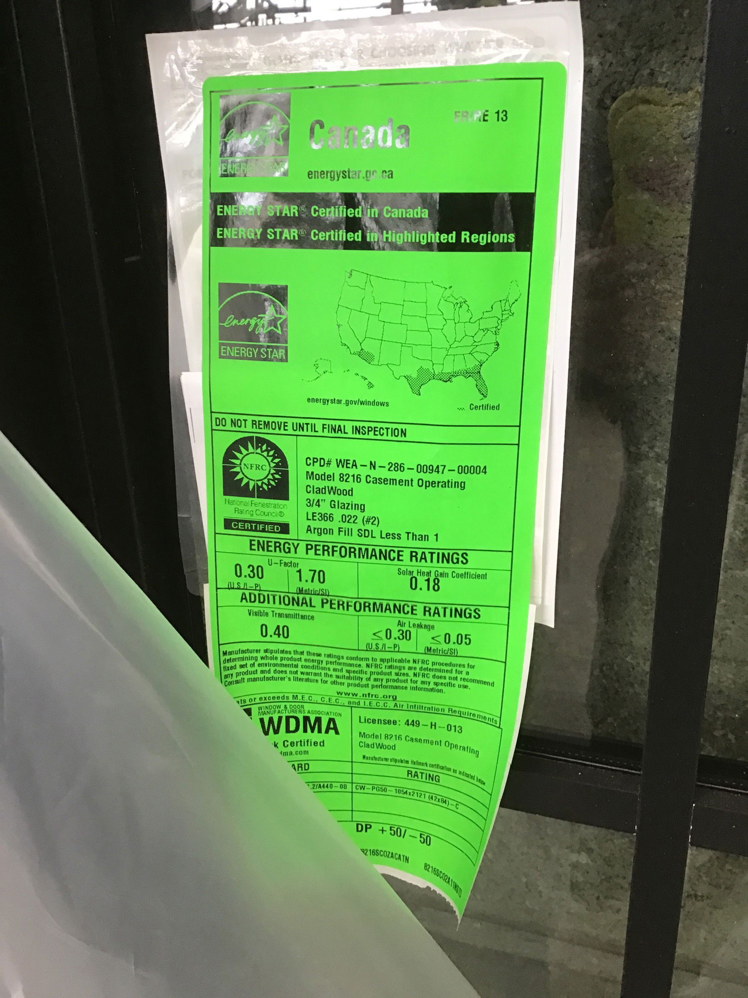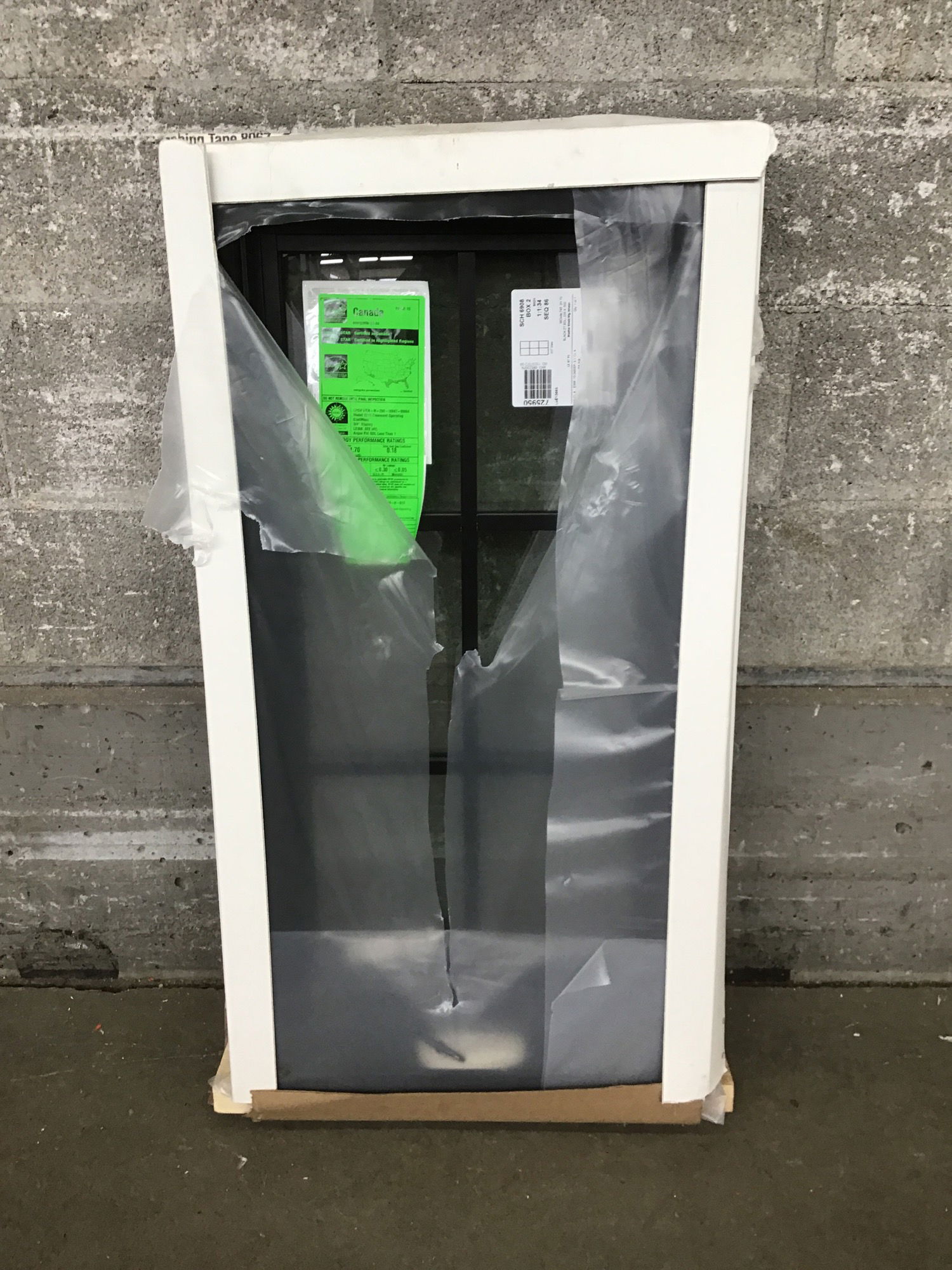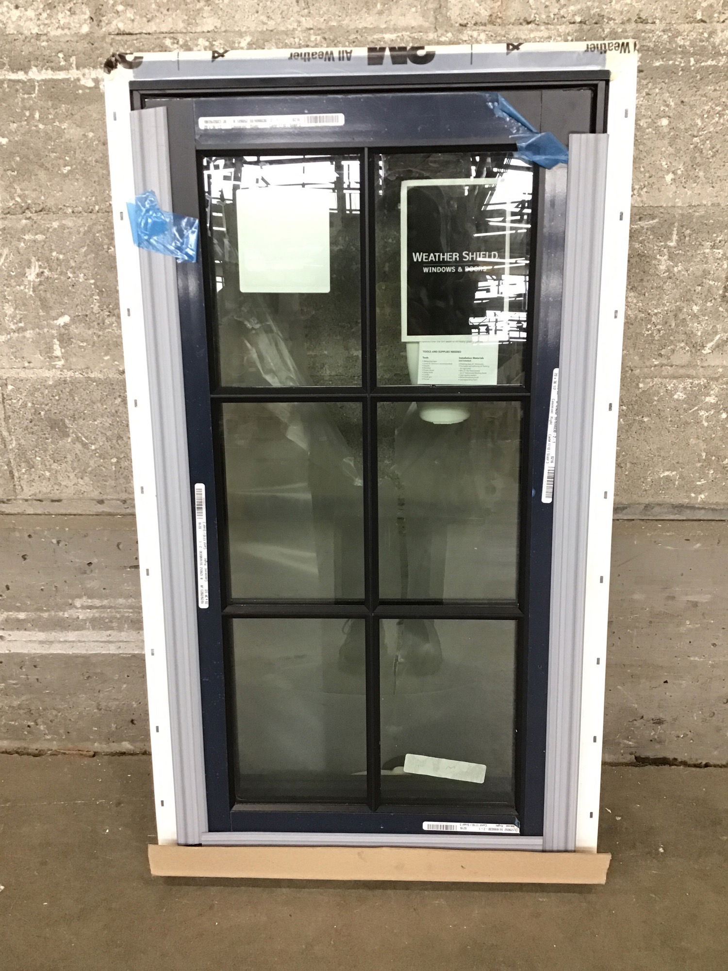 Handsome 2023 Weather Shield navy blue vinyl clad casement window, previously used as a sample at a window shop, still has energy tags attached.