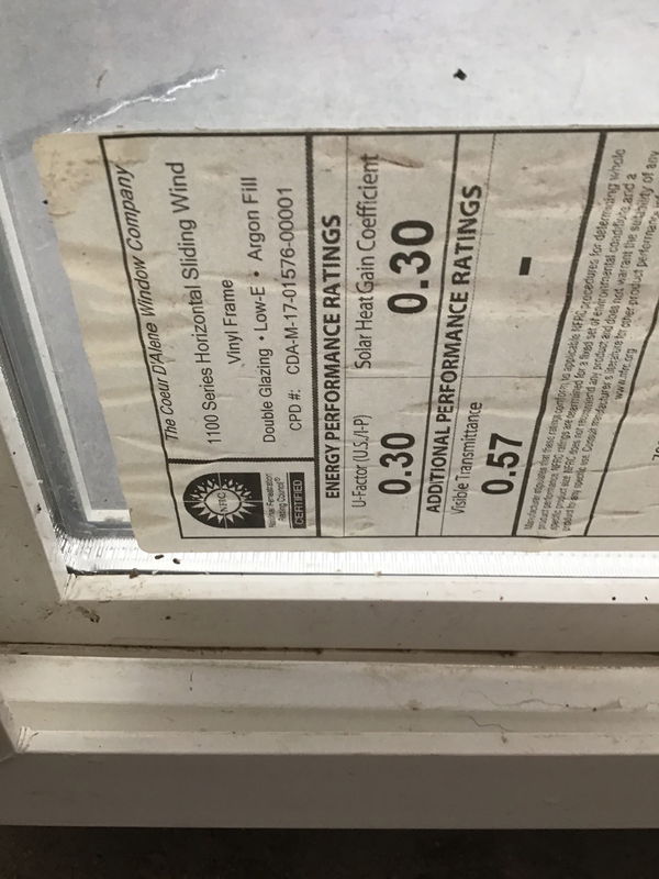 Ca. 2021 Couer d'Alene XO vinyl slider window with energy tag still attached. This does not appear to have been installed....... yet.
