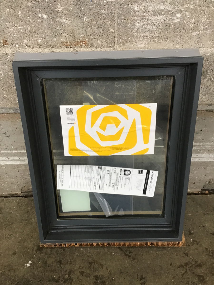 Ca. 2023 Marvin fiberglass clad window featuring a clear finished pine interior and light grey exterior. This was previously a showroom display window and has never been installed. It even has its energy tag still!