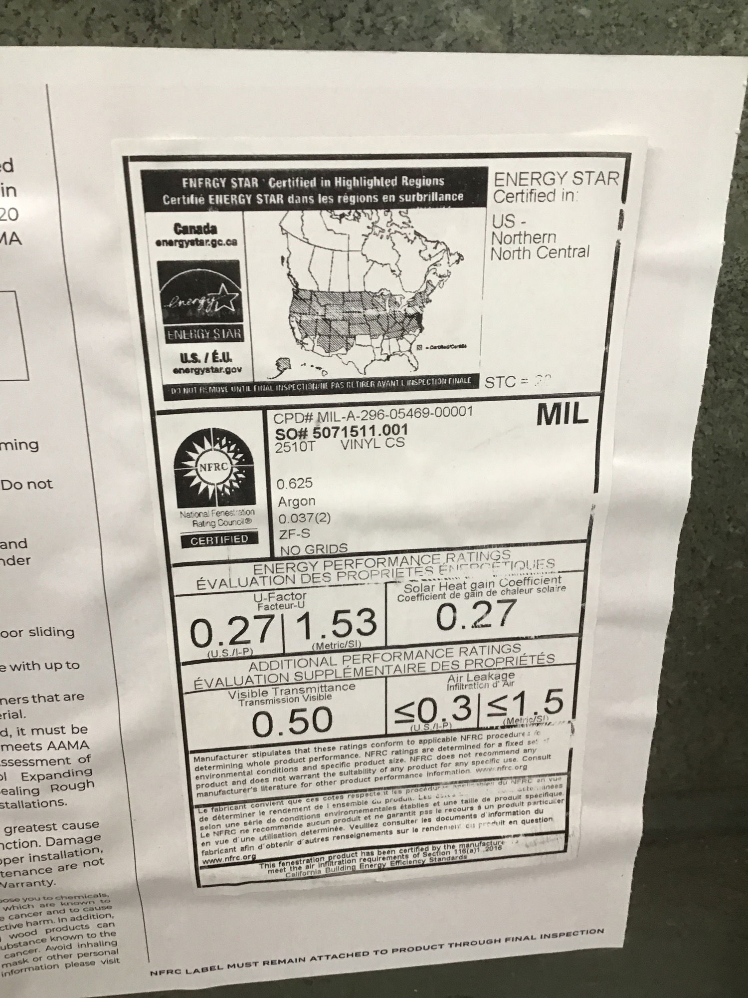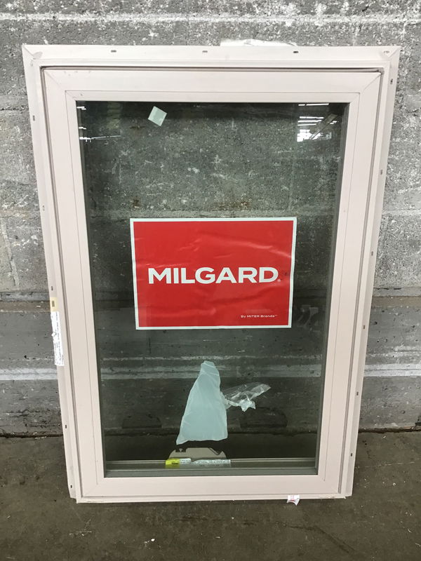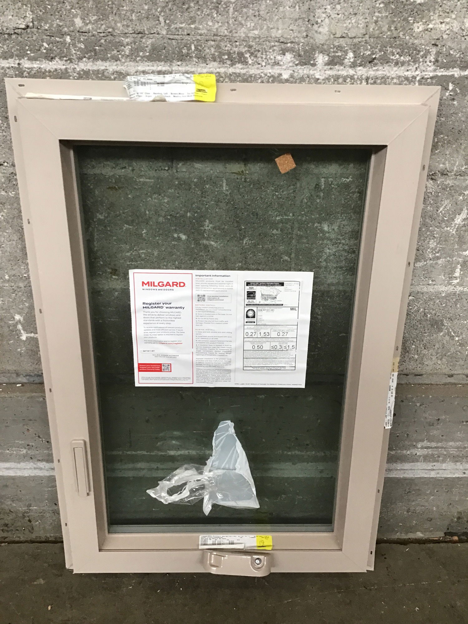 Ca. 2023 Milgard beige vinyl casement window that has never been installed and still has its energy tag attached.