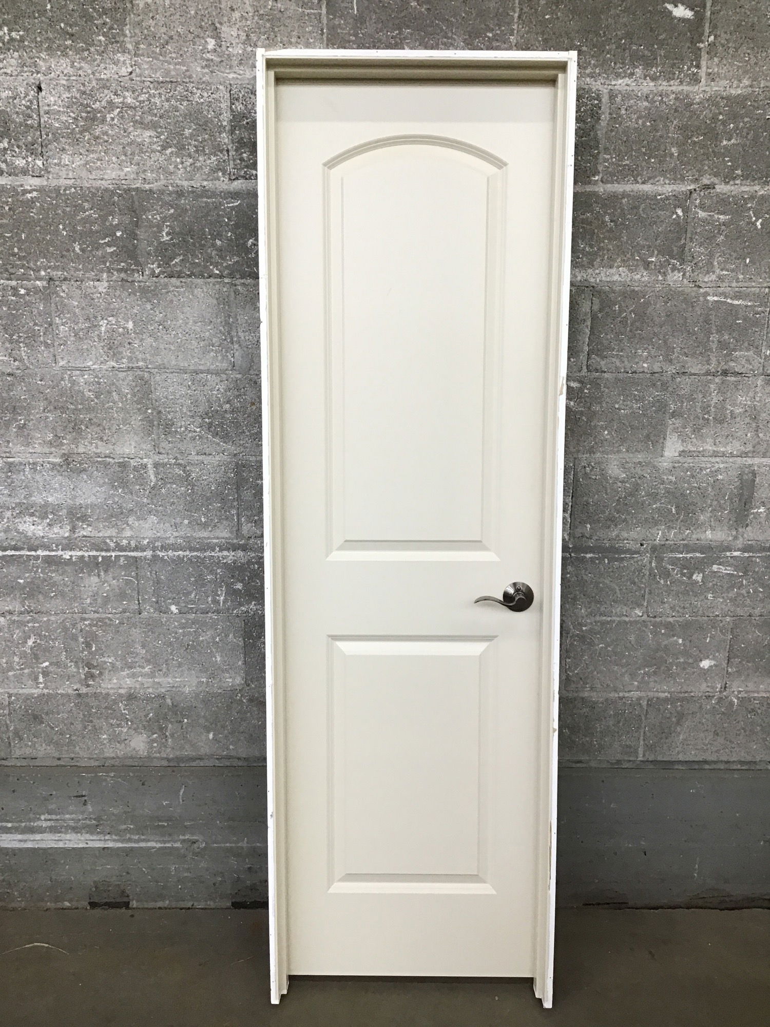 24" Two Panel Solid Core Door with two faux panels, top one is arched. Has brushed nickel passage lever set.