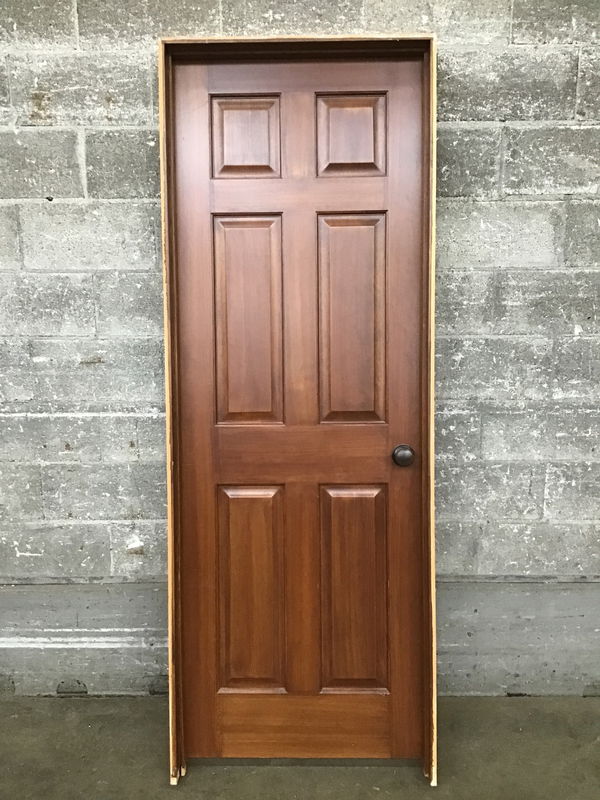 Nicely stained (medium/dark reddish brown) CVG fir raised six panel in jamb for 2x4 wall. Has nice looking antique brass finish hardware.