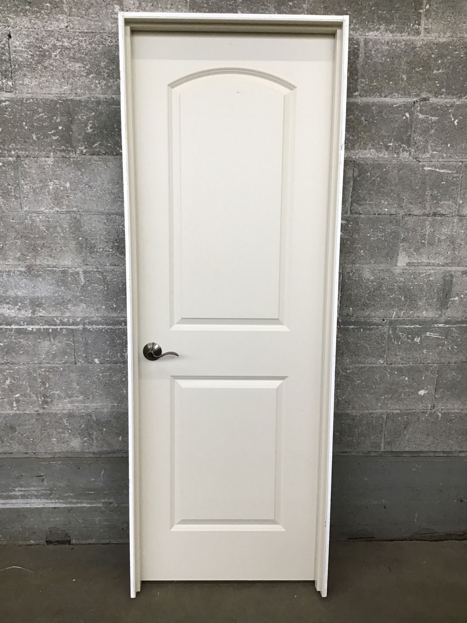 28" Two Panel Solid Core Door with two faux panels, top one is arched. Has brushed nickel passage lever set.
