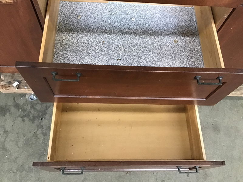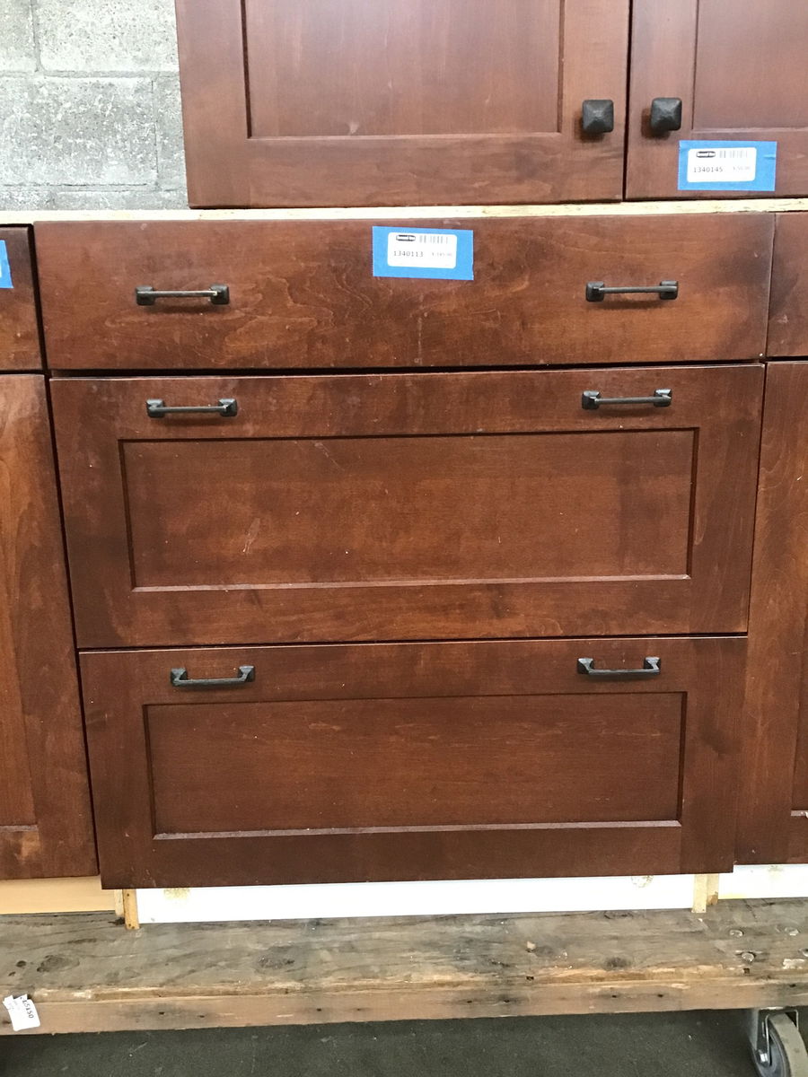 An attractive Shaker-style maple faced base cabinet with 3 drawers and antiqued brass Craftsman style pulls. All 3 drawers are full extension with undermount hardware and the lower 2 are nice and deep to accommodate pots and pans, dishware, or pantry items!