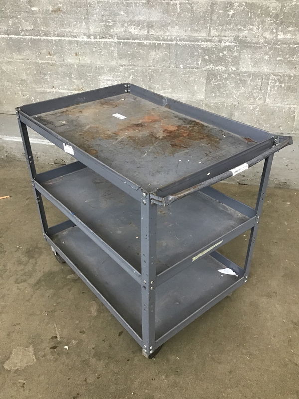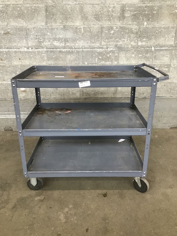 A hefty steel utility cart with 3 levels and a push handle.