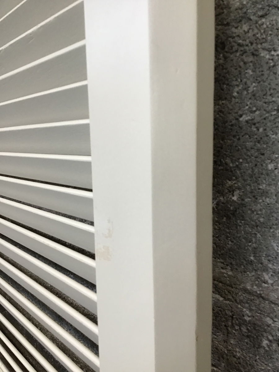 Louvered Interior Closet Door with mounting pins at the top and bottom. Painted with a coat of tan paint.