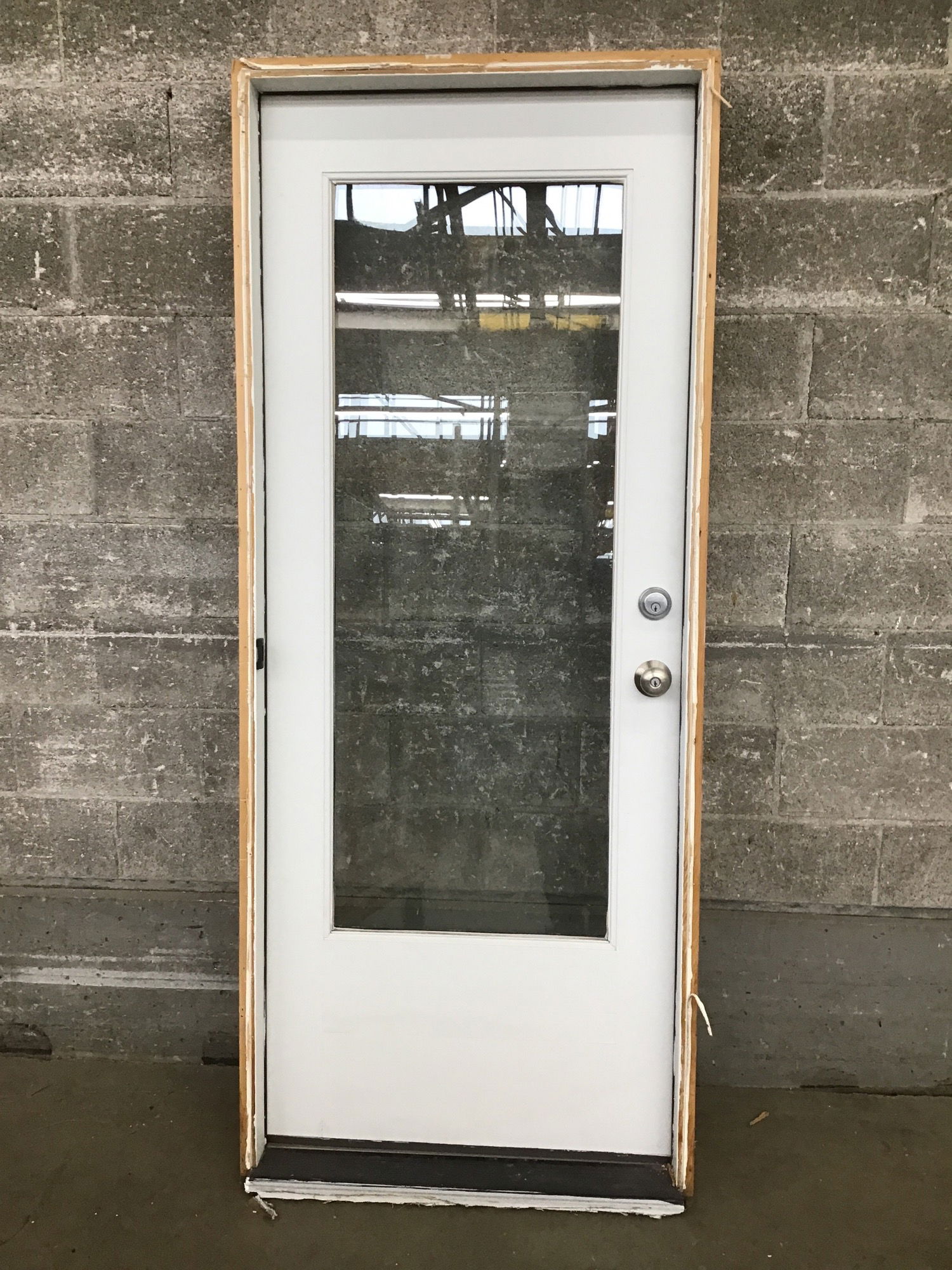 Full lite (insulated glass) door in jamb for 2x4 wall. This one could be a good candidate to shorten with its 15 1/2" tall bottom rail. It shows a little weather exposure on the exterior side, which is reflected in the price.