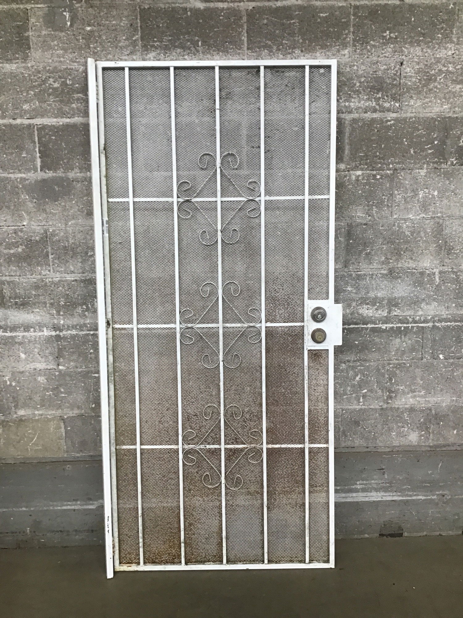 36" Steel Security Door that has it's frame piece for securing to a wall. Painted white and has the classic S-curl design. This door has two deadbolts but no keys.