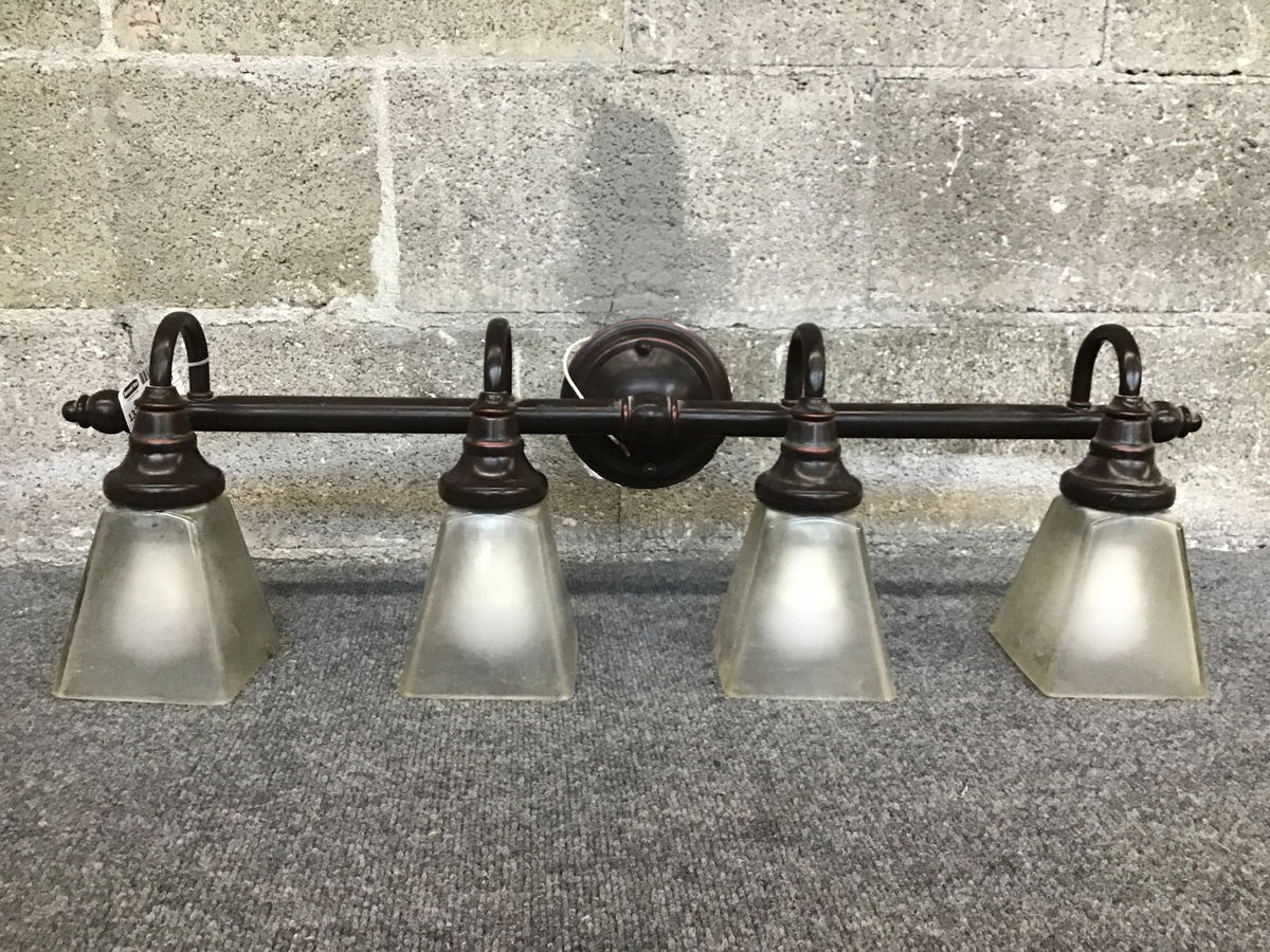Standard 4-arm vanity light with square frosted glass shades and an oiled bronze finish.