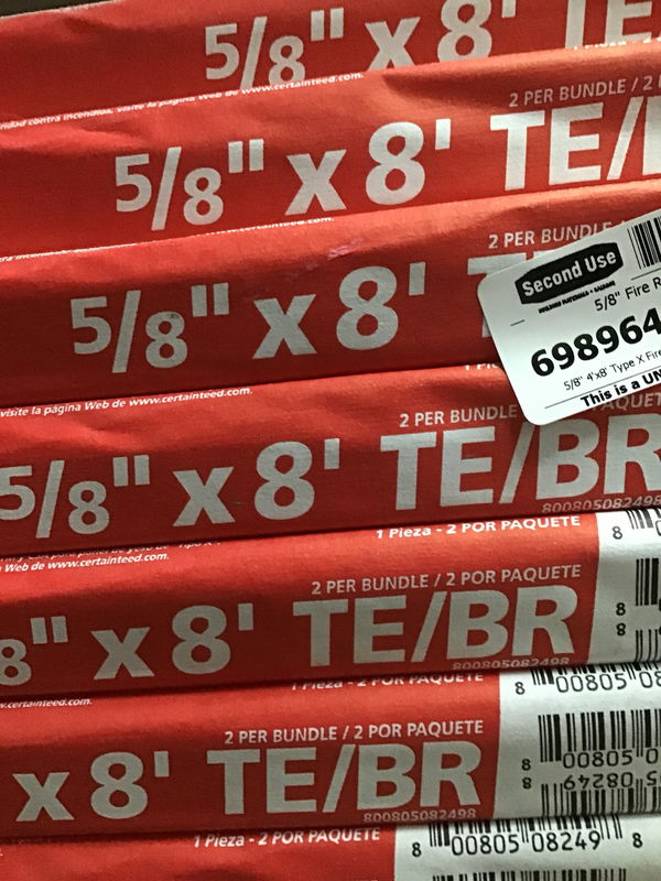 5/8" 4'x8' Type X Fire Resistant gypsum board by CertainTeed. Condition for each sheet varies with some minor corner damage here and there. Overall in good condition but hurry for the best selection. This is a bulk item. No holds please.