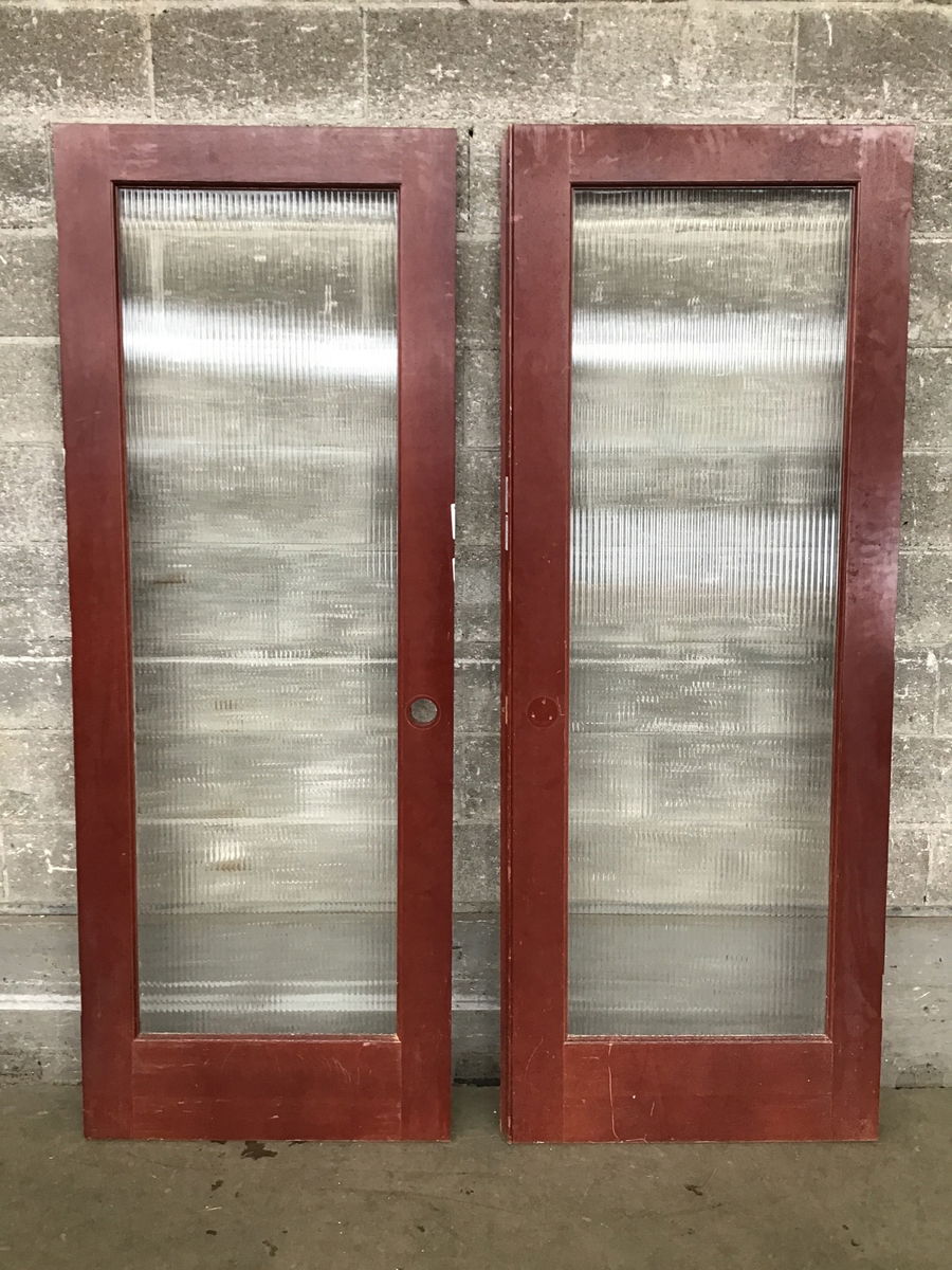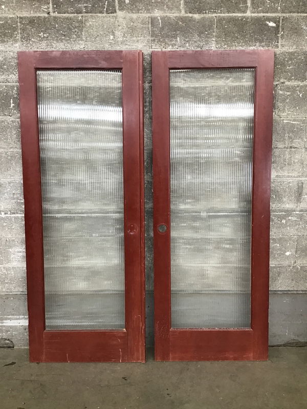 Pair of dark reddish stained CVG fir full lites with obscured reed glass. One has an astragal