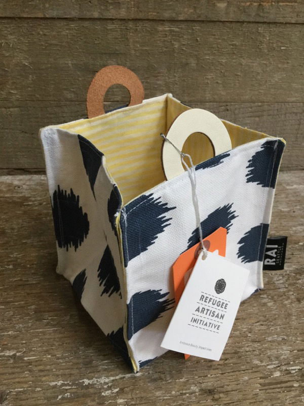 These stylish, hand-sewn, ethically-made, reusable gift baskets are the perfect vessel for a one of-a-kind-gift to your loved ones. Don’t limit these versatile storage cubes to just gifting though! Use them as both organization and as decor in your home, be it in your home office, your car, your closet, or your living room. This canvas cube is fully lined and comes with leather handles. Second Use is proud to partner with the Refugee Artisan Initiative to offer this item. RAI partners with immigrant women to foster an inclusive prosperous transition to the US through artisan skills training, while utilizing upcycled materials to do it! Measures 5.5" x 4.5".