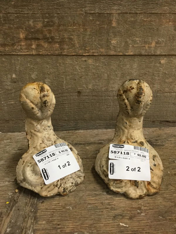 Painted pair of cast iron claw feet from a clawfoot tub. Use as home decor (maybe book ends?) or clean them up and use them for your tub! These match 587120 if you're looking for a full set; they're aesthetically different but would match the same style of tub.