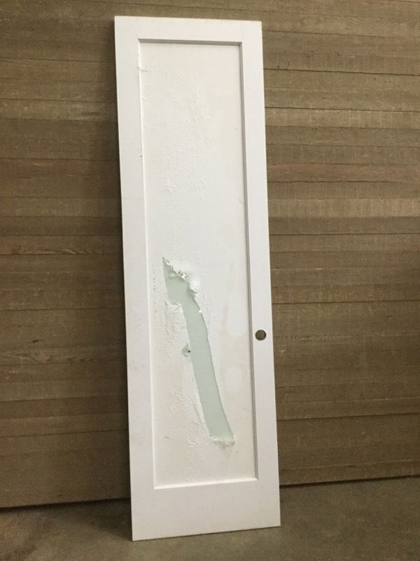 Never installed, primed masonite, clear glass full lite interior door. May have minor cosmetic damage.