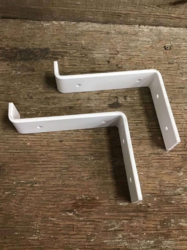 Pair of custom steel shelf brackets fabricated by a local family operation. Powder coated white, with a lipped front, facing up, and mounts on the back. Length listed for the shelf itself. Made for a 5.25" wide board.