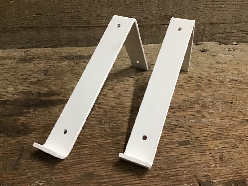 Pair of bent 1/4" steel shelving brackets with a white powdercoat. Fabricated by a local family-run operation. Brackets made to hold a board <9" wide, has a 1" lip.