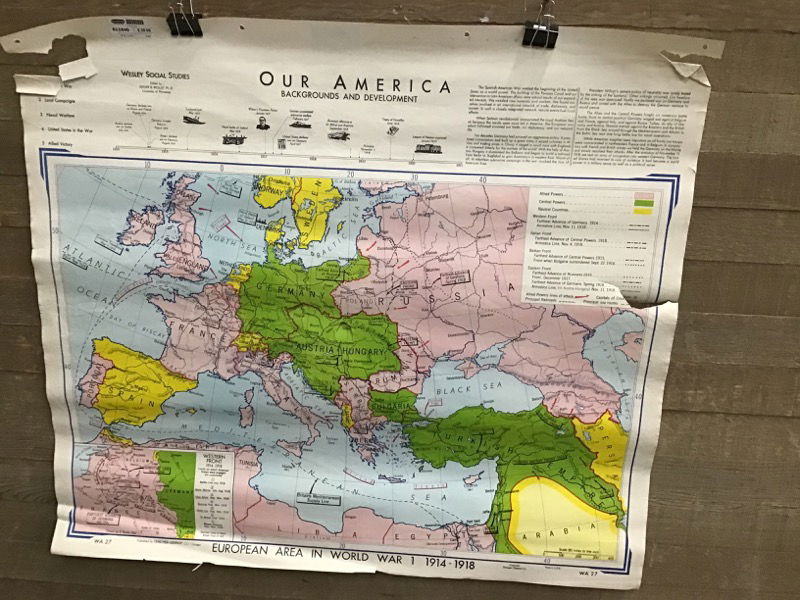 Vintage, linen style, double sided map with the subjects of European Area in World War I 1914-1918 on one side and Colonial Development 1690-1774 on the other. Has nice color, but unfortunately a repaired (with clear tape) puncture near the middle, another tear on an edge, and possibly other small blemishes. This one is being sold as a loose unit with no hanger. Price reflects condition. Believe this map was made just after 1965.
