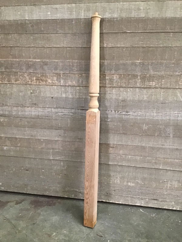 Unused hemlock &/or fir, joined newel post that may have minor cosmetic damage (small chips or dents, stable cracks), may be unfinished (e.g. may have material from the lathe/turning process still attached, we'll show this in photos if present). Probably paint grade, but you might use it with a stain if you put a little work into it.