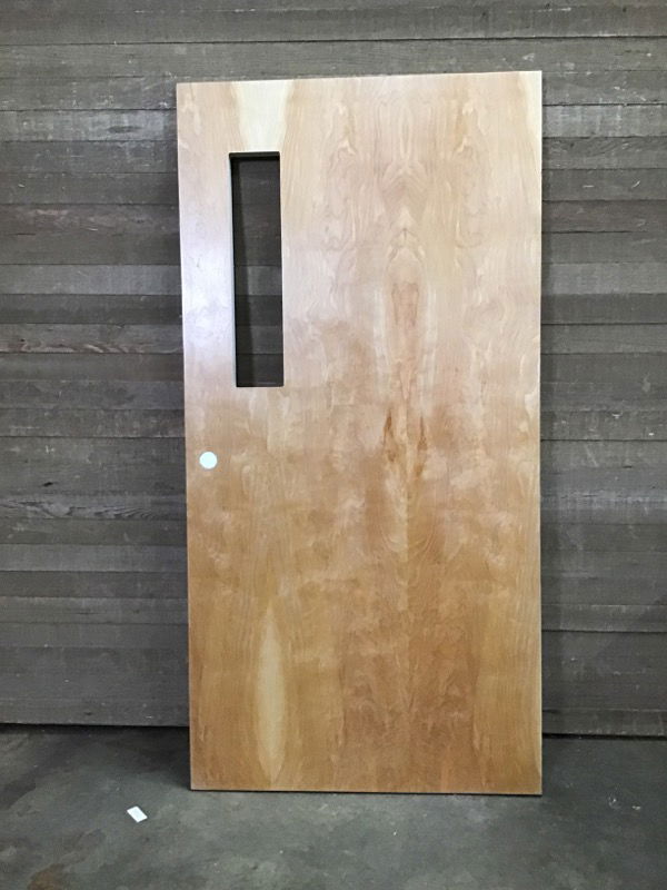 Heavy wood veneer fire door with 6x27" cutout for window will need glass installed. Label says it has a 1.5 hour fire rating. Made by Western Oregon Door. Has some small blemishes but is in overall good condition. Photo may be representational.