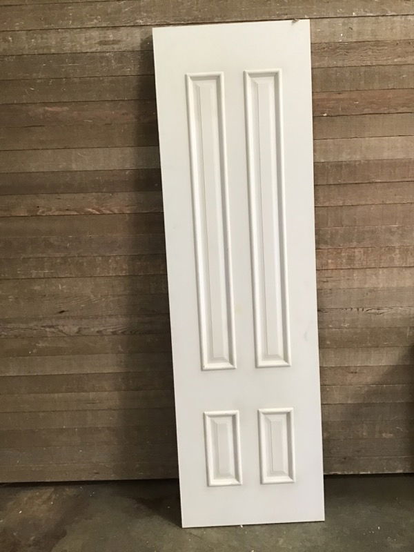 4 faux panel door with masonite skin. Raised panels with molding, Victorian style. Drilled for a cylinder latch set.