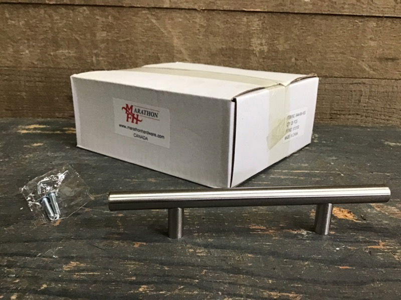 Box of 25 new in box cabinet pull bars from Marathon Hardware, in a brushed nickel finish, 4-in width centers. Bulk item so no holds.