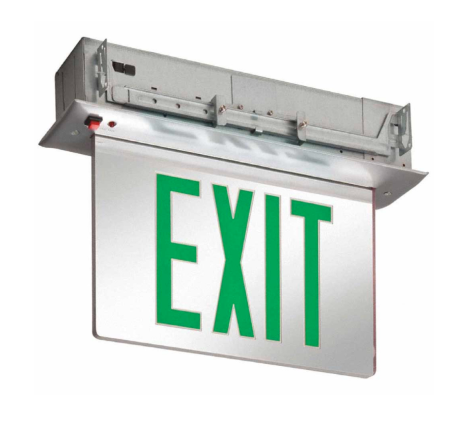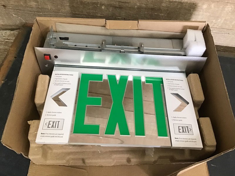 New in box EDGR single face, recessed mount, LED, green, edge-lit EXIT sign w/ battery backup in brushed aluminum from Lithonia Lighting. Retails new for $260.