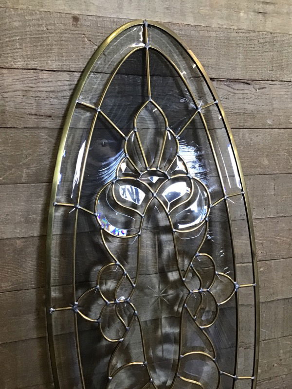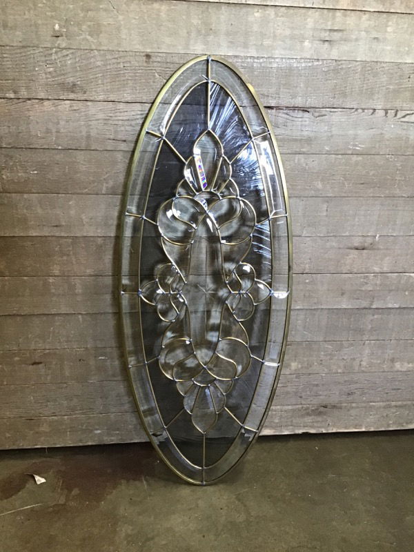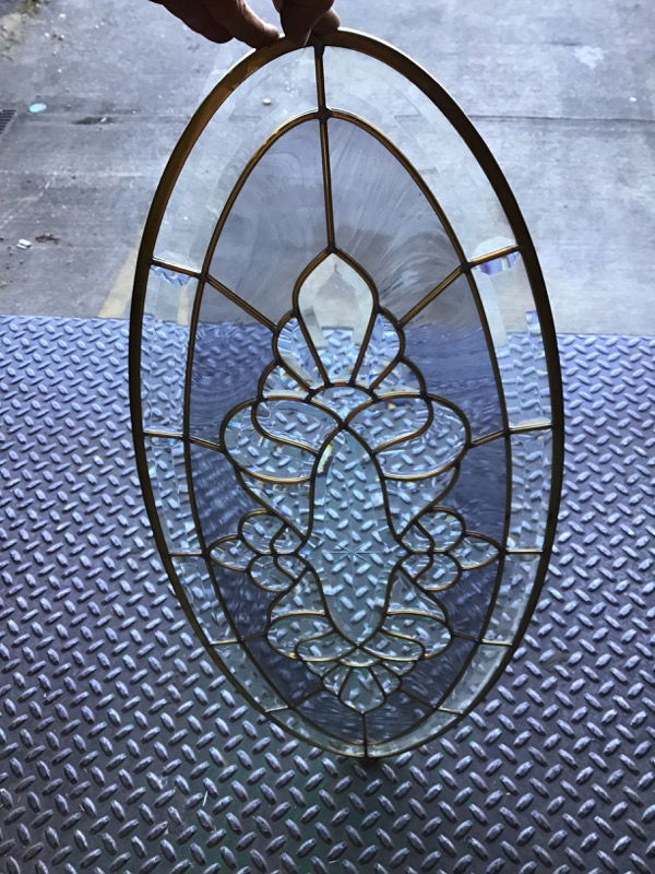 Brass leaded glass oval insert featuring 57 wavy and textured glass panes w/ circle of dark tinted glass. Photo may be representational. Bulk item, no holds.