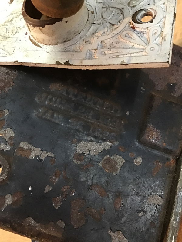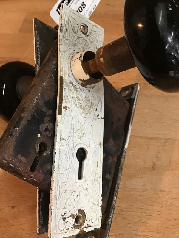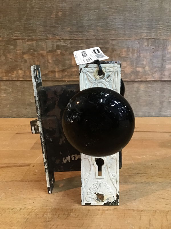 Gorgeous antique interior knobset with glossy black ceramic knobs and Art Nouveau style escutcheons. Mortise box reads "Patented June 25 1881; Jan 26 1886". Measurements shown are for the mortise box.