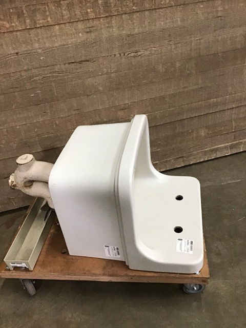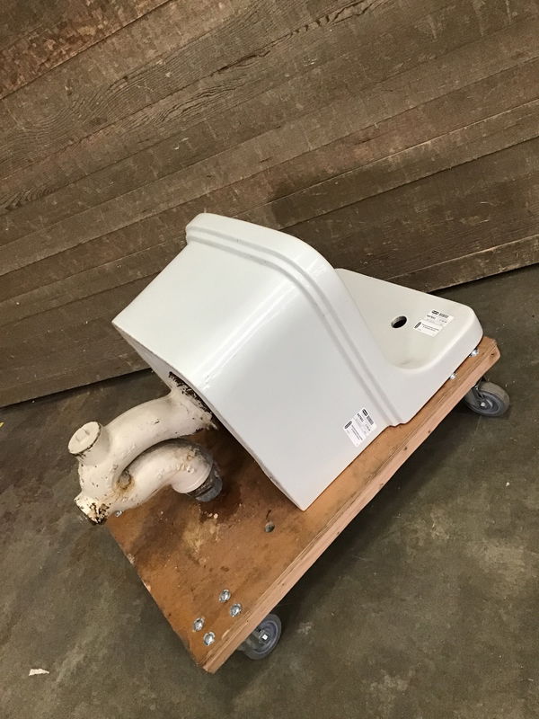 This is a vintage Standard brand commercial use utility sink. Shows signs of age and wear but in overall great condition. Measurements are of sink only, with pipes height measures 37" in total. Made in USA and dated May 4, 1945 on back. Number on back is 7660-22-79. Looks to be some damage on the threads of the pipe bottom, and some rusting where the pipes join the sink. Comes with original mounting brackets. Check here for more info about this project.