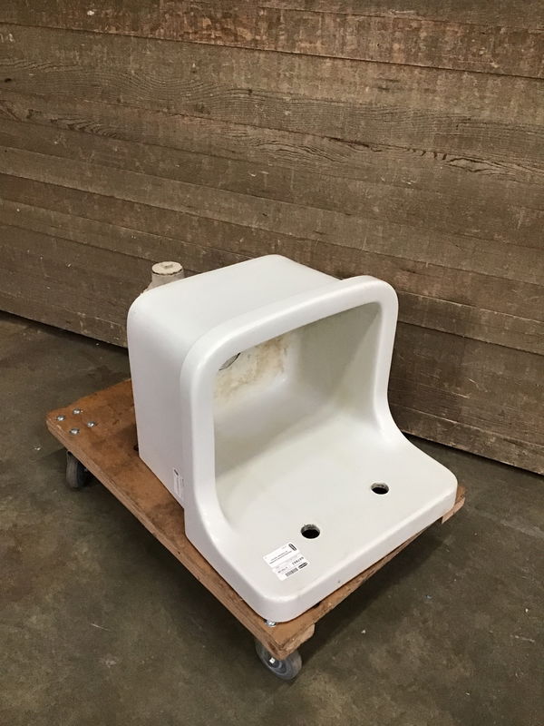 This is a vintage Standard brand commercial use utility sink. Shows signs of age and wear but in overall great condition. Measurements are of sink only, with pipes height measures 37" in total. Made in USA and dated April 5, 1945 on back. Number on back is 7650-22-99. Looks to be some damage on the threads of the pipe bottom, and some rusting where the pipes join the sink. Comes with original mounting brackets. Check here for more info about this project.