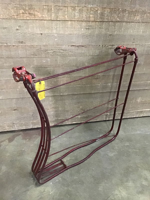 Red iron/steel wall-hung firehose reel frame. Could turn this into storage or something else cool. Photo may be representational. Check here for more info about this project.